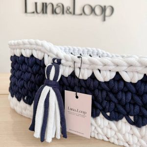 Crochet Nappy Caddy – White & Navy