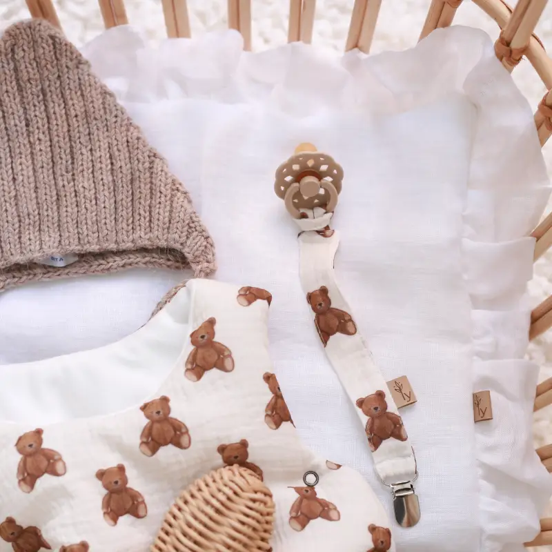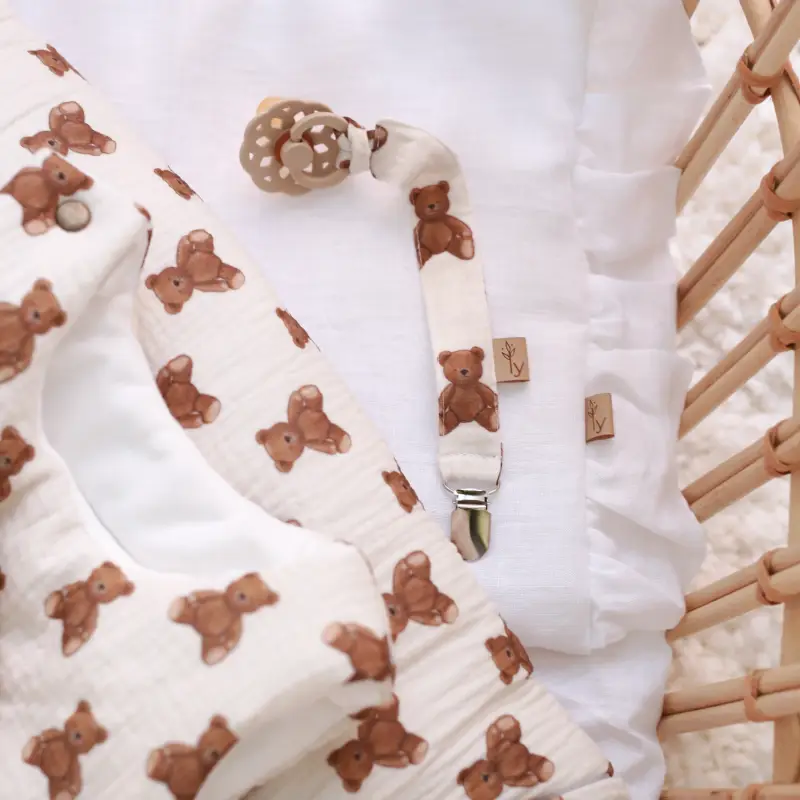 Beautifully designed and thoughtfully crafted, this lightweight dummy clip combines functionality with gentle style. The soft cotton bow band features a charming teddy bear design and attaches easily to most pacifiers, helping you keep your baby’s soother clean, secure, and always within reach.