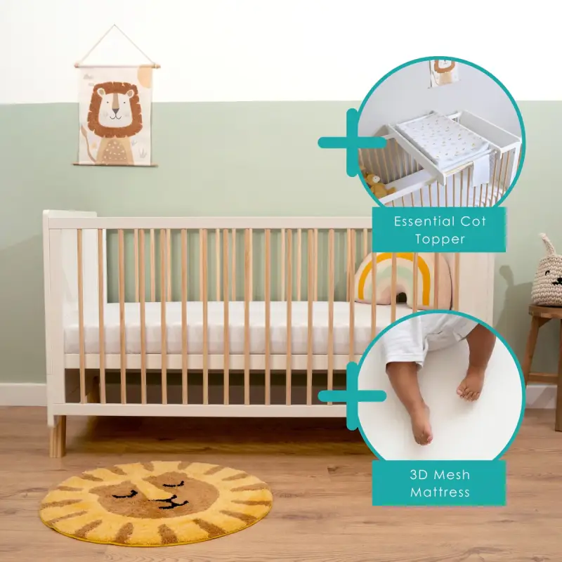 Three Height Settings: As your baby grows, so does the Essentials Cot Bed. With three adjustable height positions, this versatile cot ensures that your little one sleeps comfortably at every stage of their development. From the high-set newborn position to the lower settings for active toddlers, the cot bed adapts to your child’s changing needs.