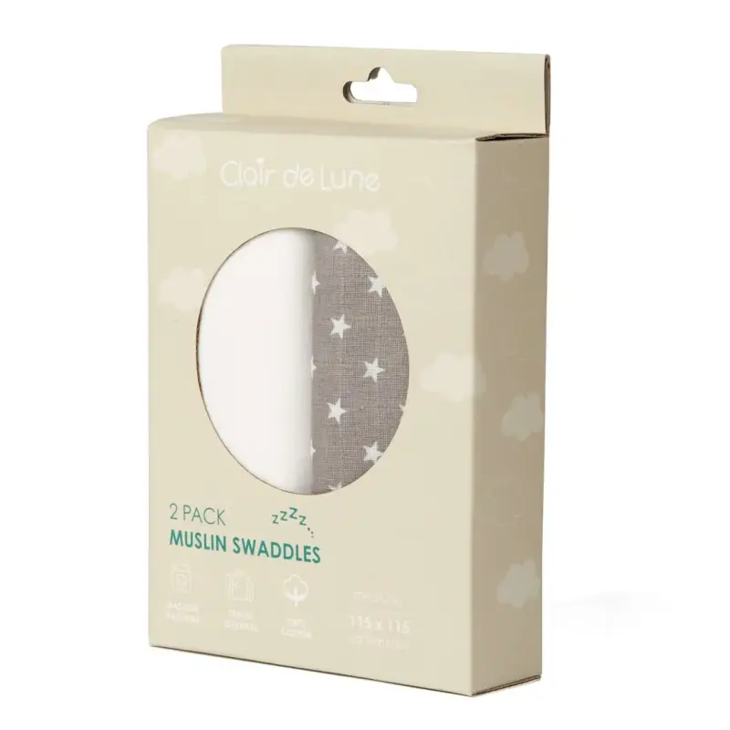 Made from breathable and soothing 100% cotton, the Clair de Lune Star Muslin Squares are a must-have for everyday baby care. This stylish 3-pack features grey and white star prints in a classic colour palette — soft, gentle, and designed for versatility.