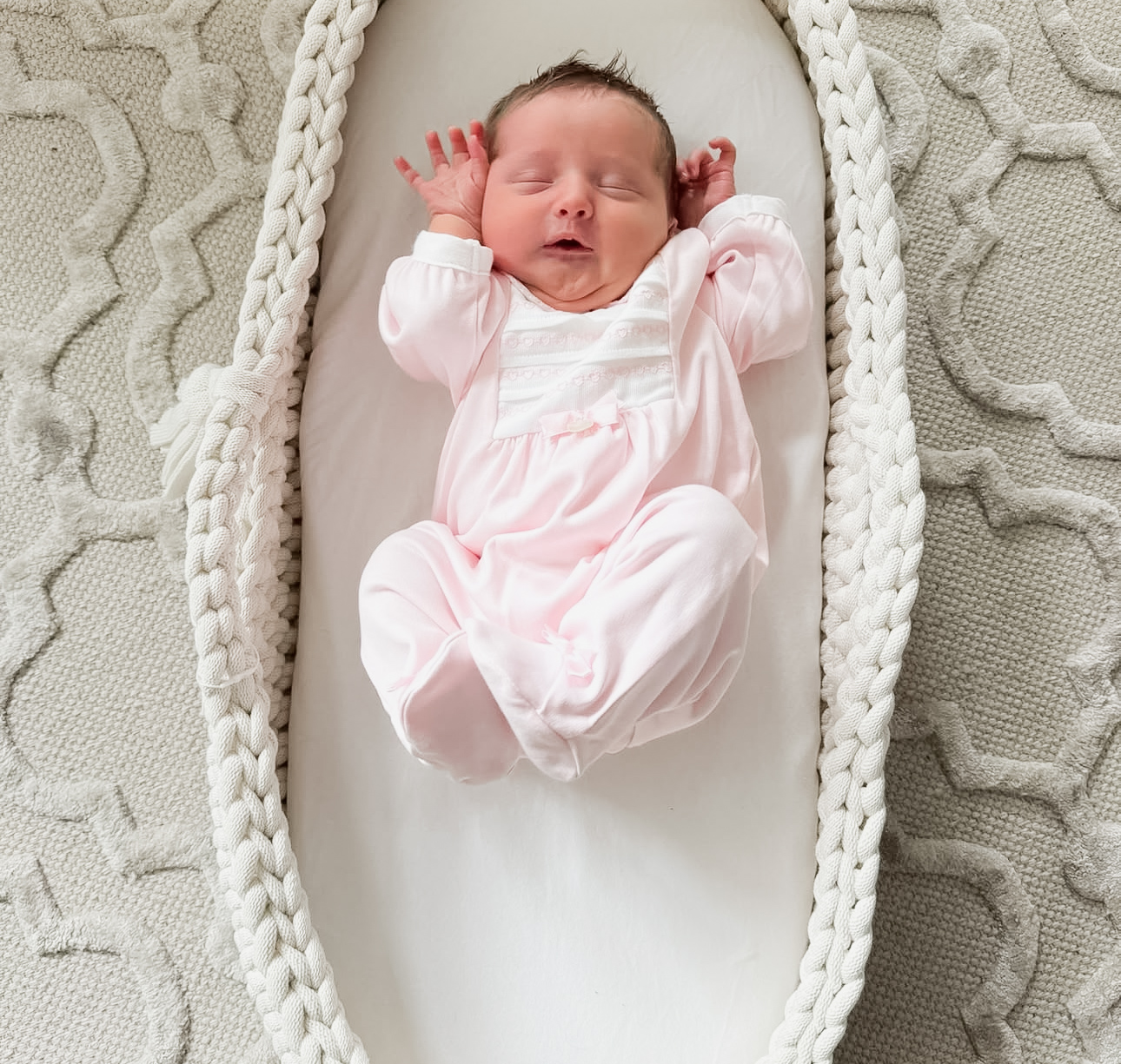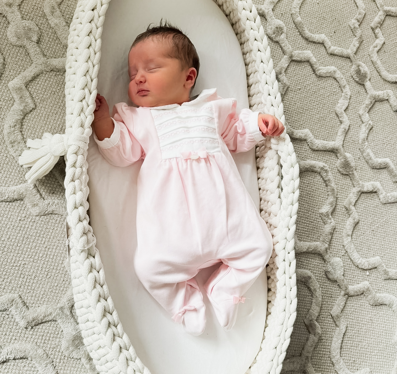 Measuring 75 × 29 cm, the basket is suitable from birth up to 9 kg, or until your baby starts rolling over, sitting up unaided, or pulling themselves up. Always place on a flat, dry surface.