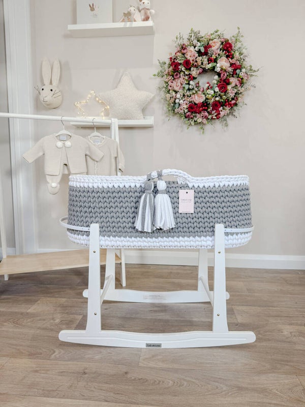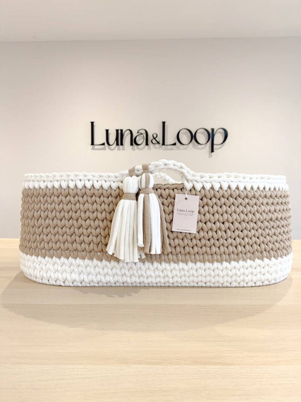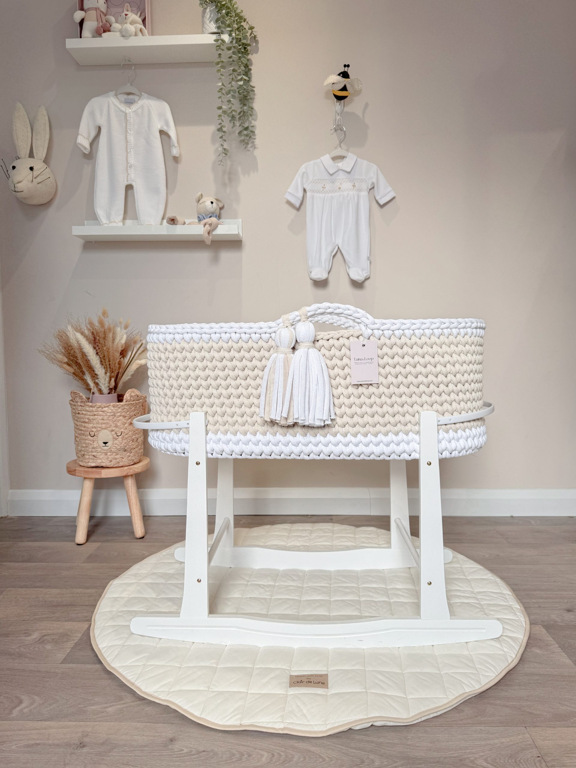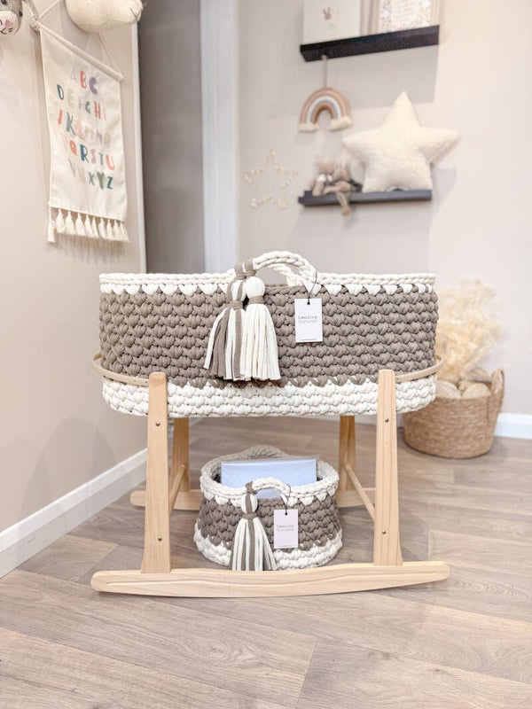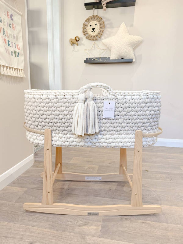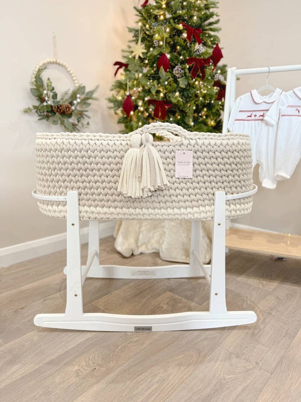 Welcome your little one into the world with our beautifully handcrafted Crochet Moses basket, made from soft, natural recycled cotton yarn. Thoughtfully designed to offer a cosy and safe space for your newborn, it’s a charming blend of traditional craftsmanship and modern sustainability. Certified by OEKO-TEX® Standard 100, you can rest assured no harmful substances have been used in the production or dyeing of the cotton – only the gentlest materials for your baby’s skin.