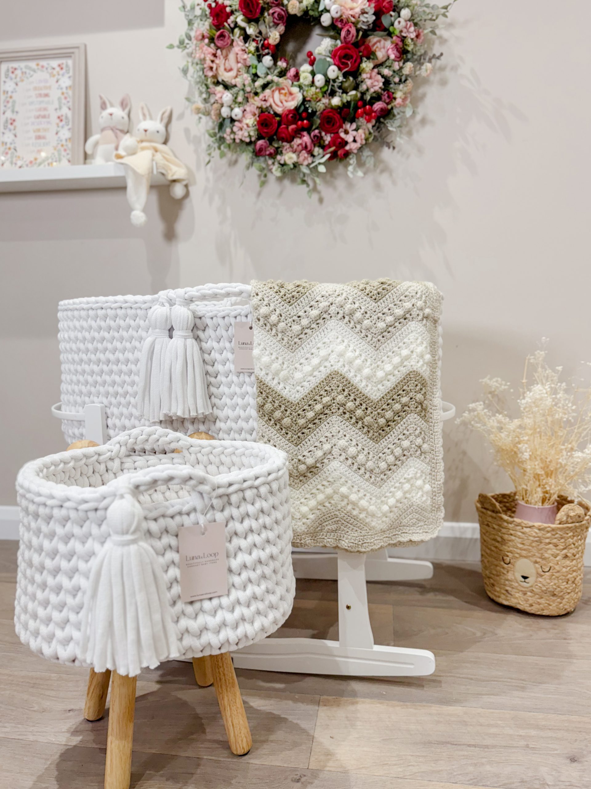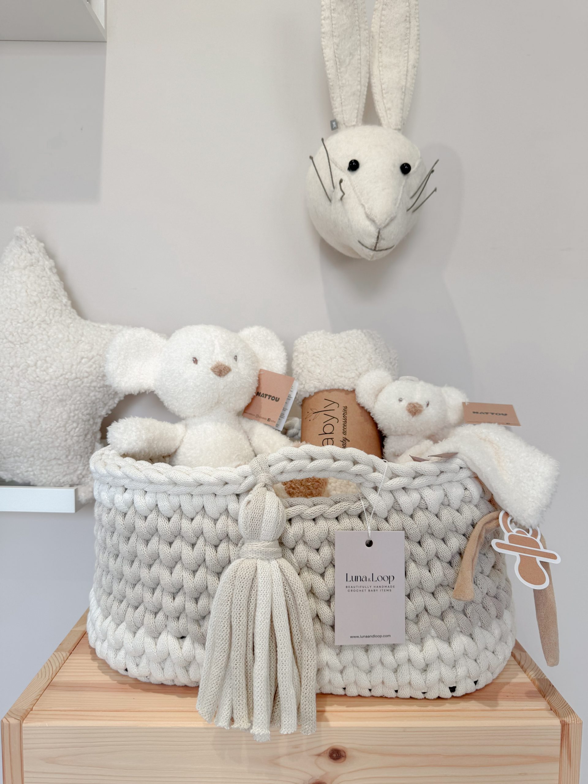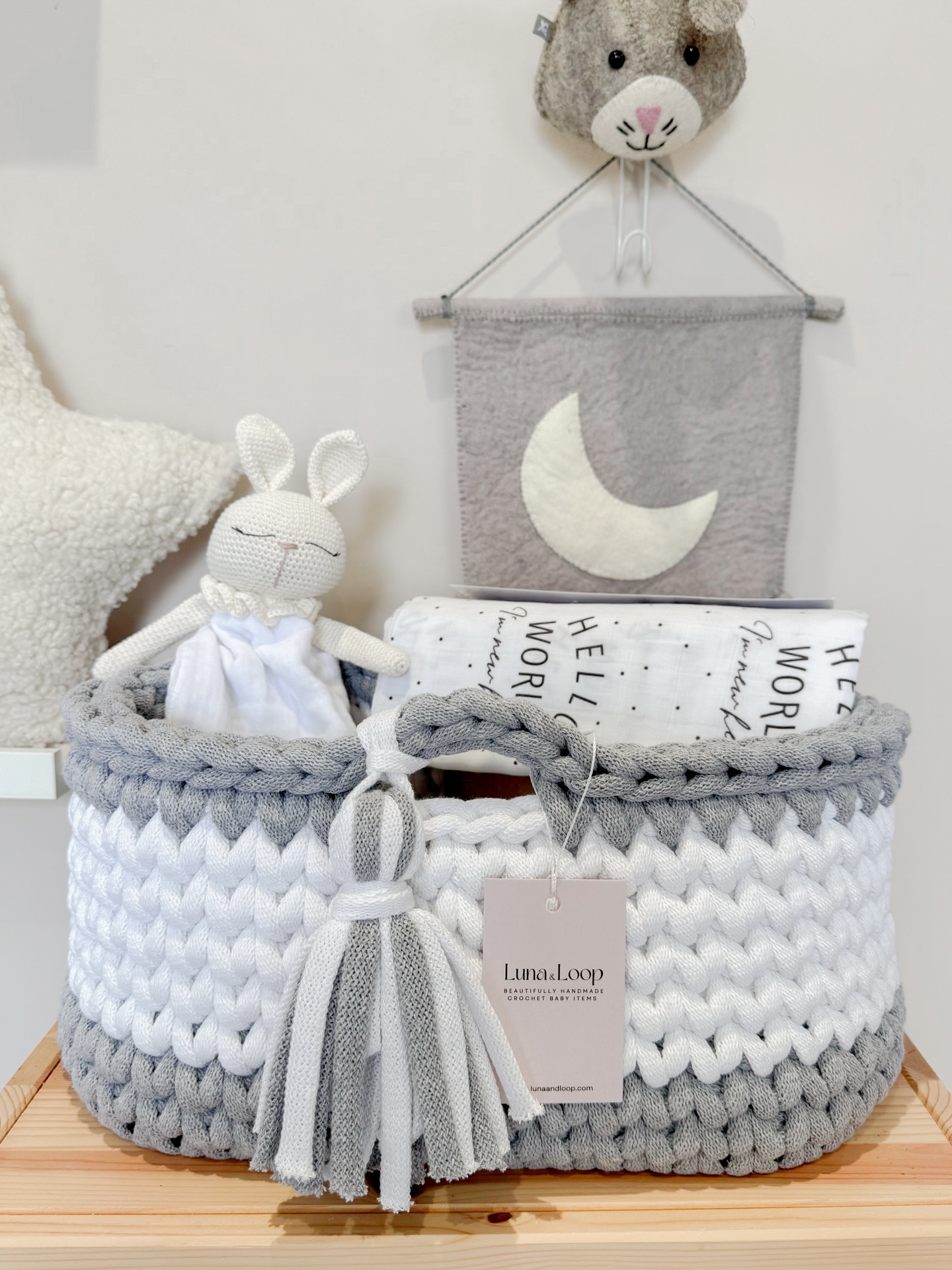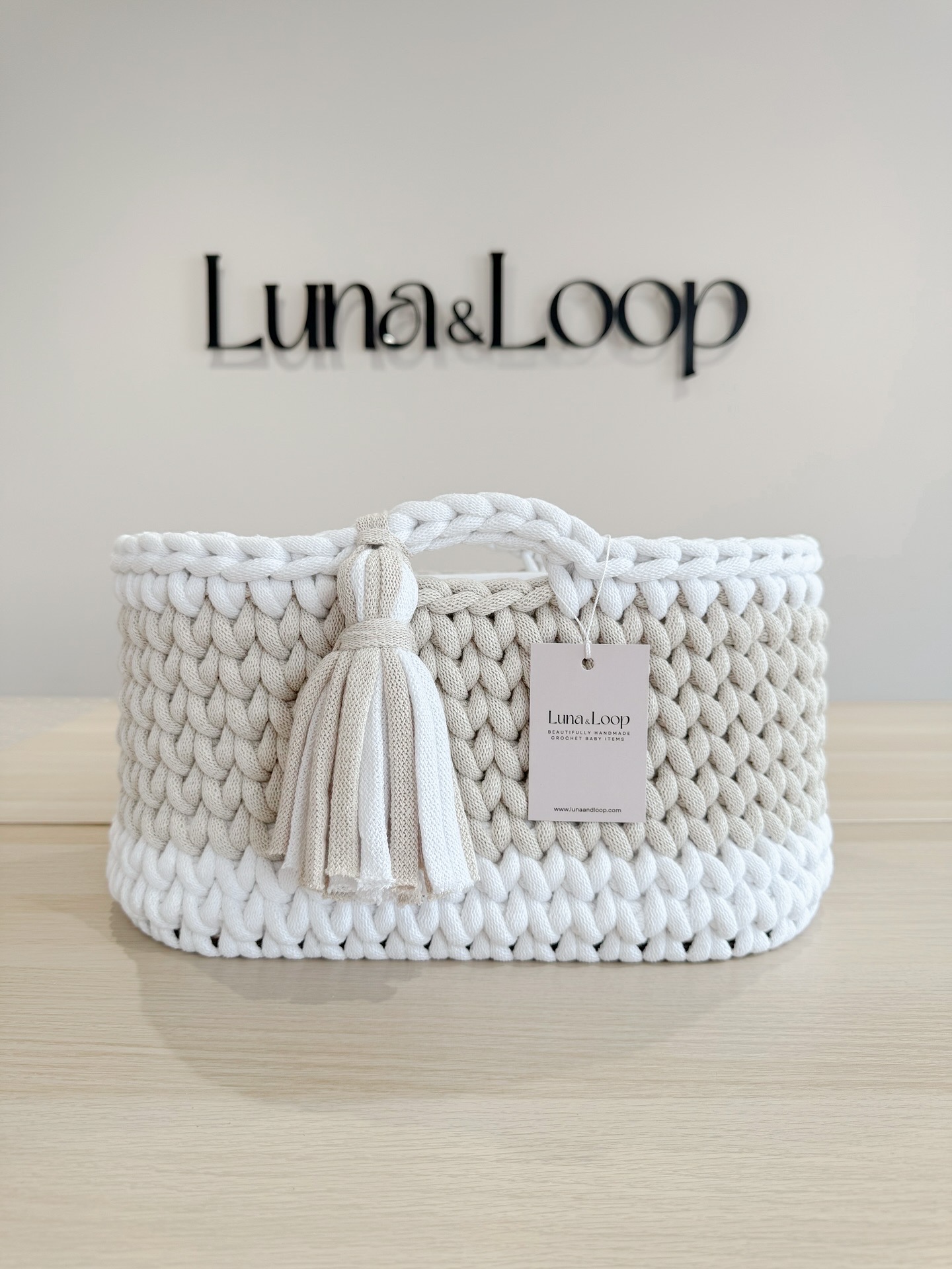 Our Luna & Loop Crochet Nappy Caddy is the perfect way to keep your baby’s essentials beautifully organised — from nappies and wet wipes to muslins, blankets, and comforters.