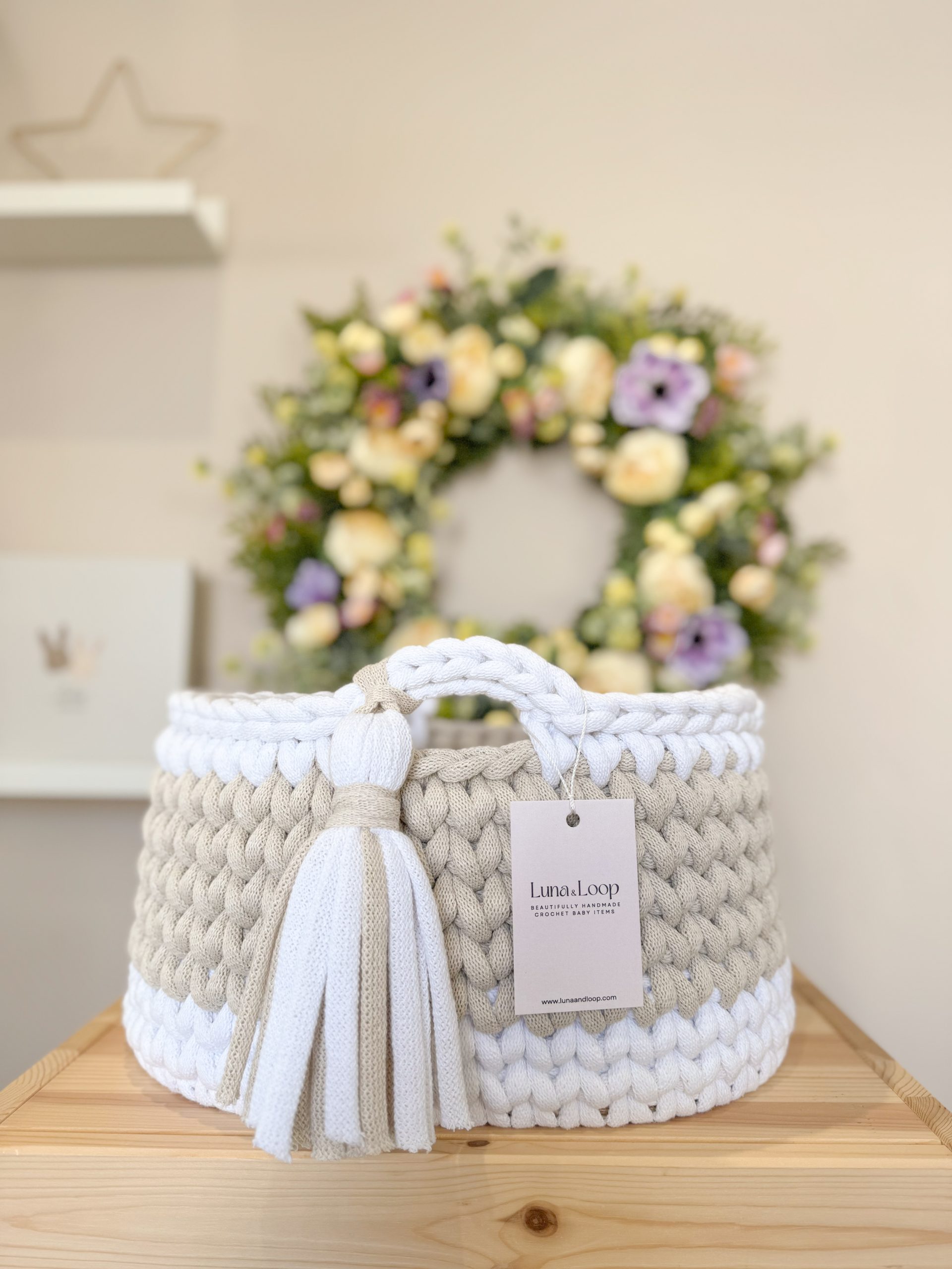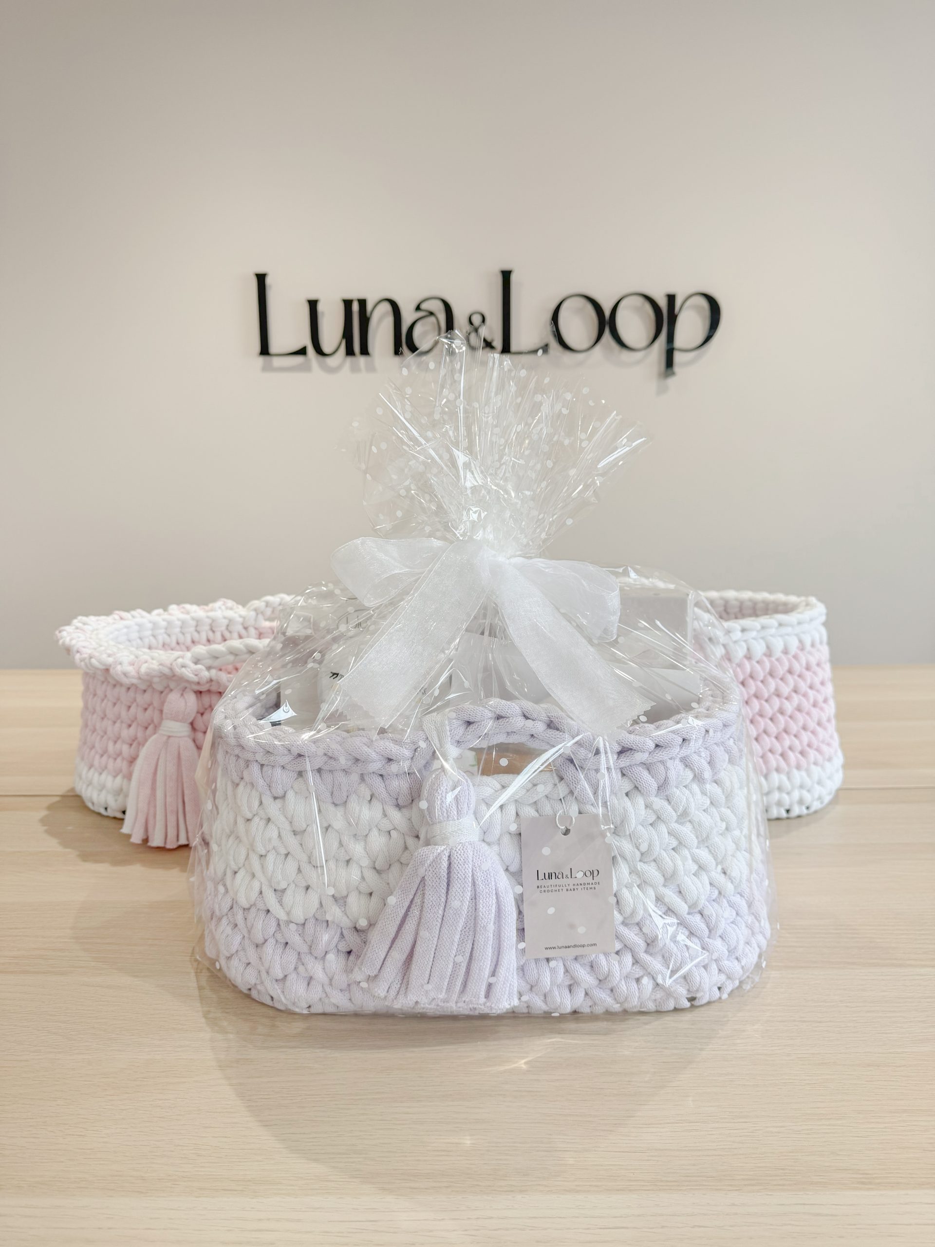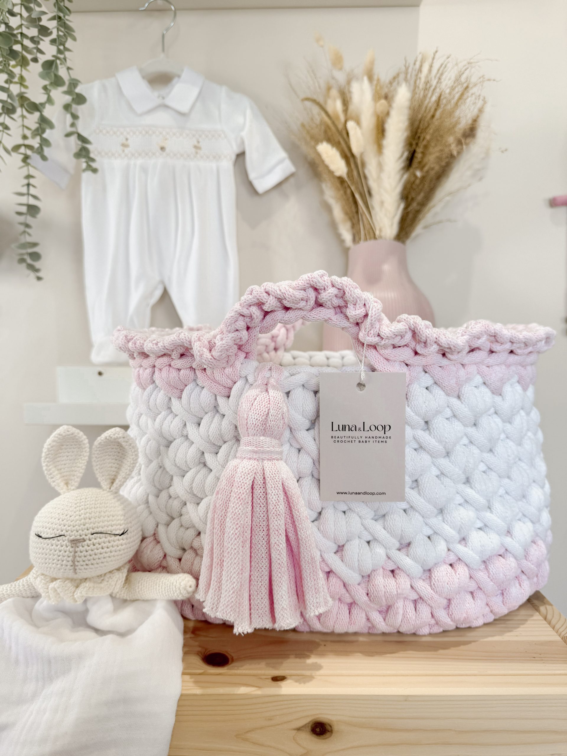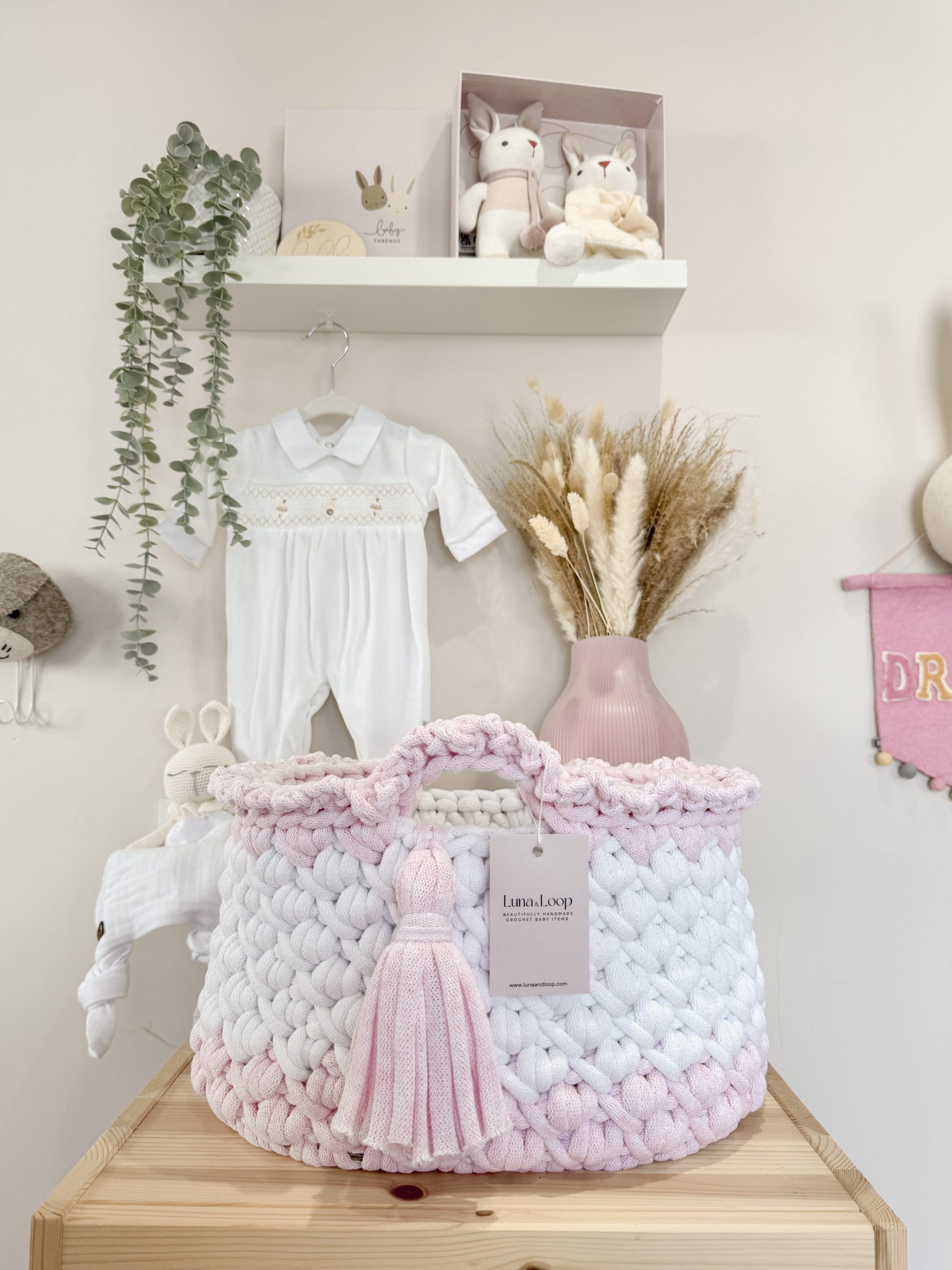 Our Luna & Loop Crochet Nappy Caddy is the perfect way to keep your baby’s essentials beautifully organised — from nappies and wet wipes to muslins, blankets, and comforters.