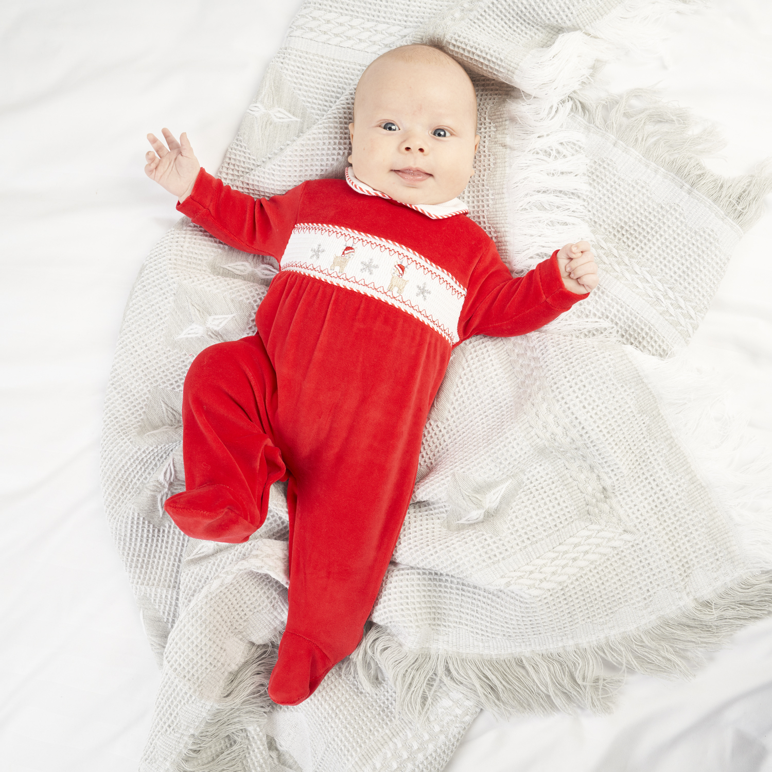 Part of the charming Dandelion Christmas Collection, this festive sleepsuit is full of thoughtful details to make the season extra special. The beautifully smocked front is delicately embroidered with reindeers and silver stars, capturing the magic of Christmas in a subtle, timeless way.