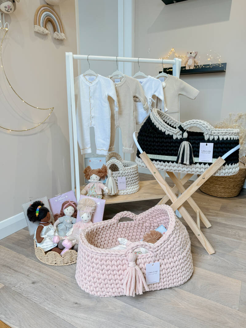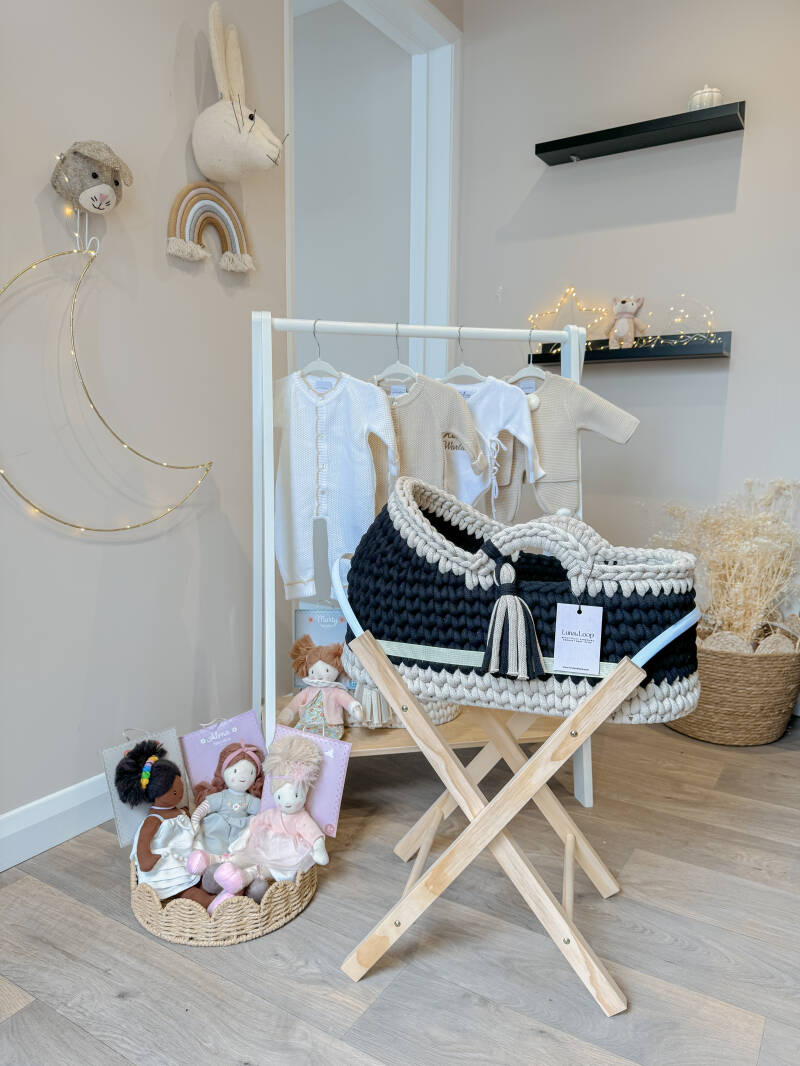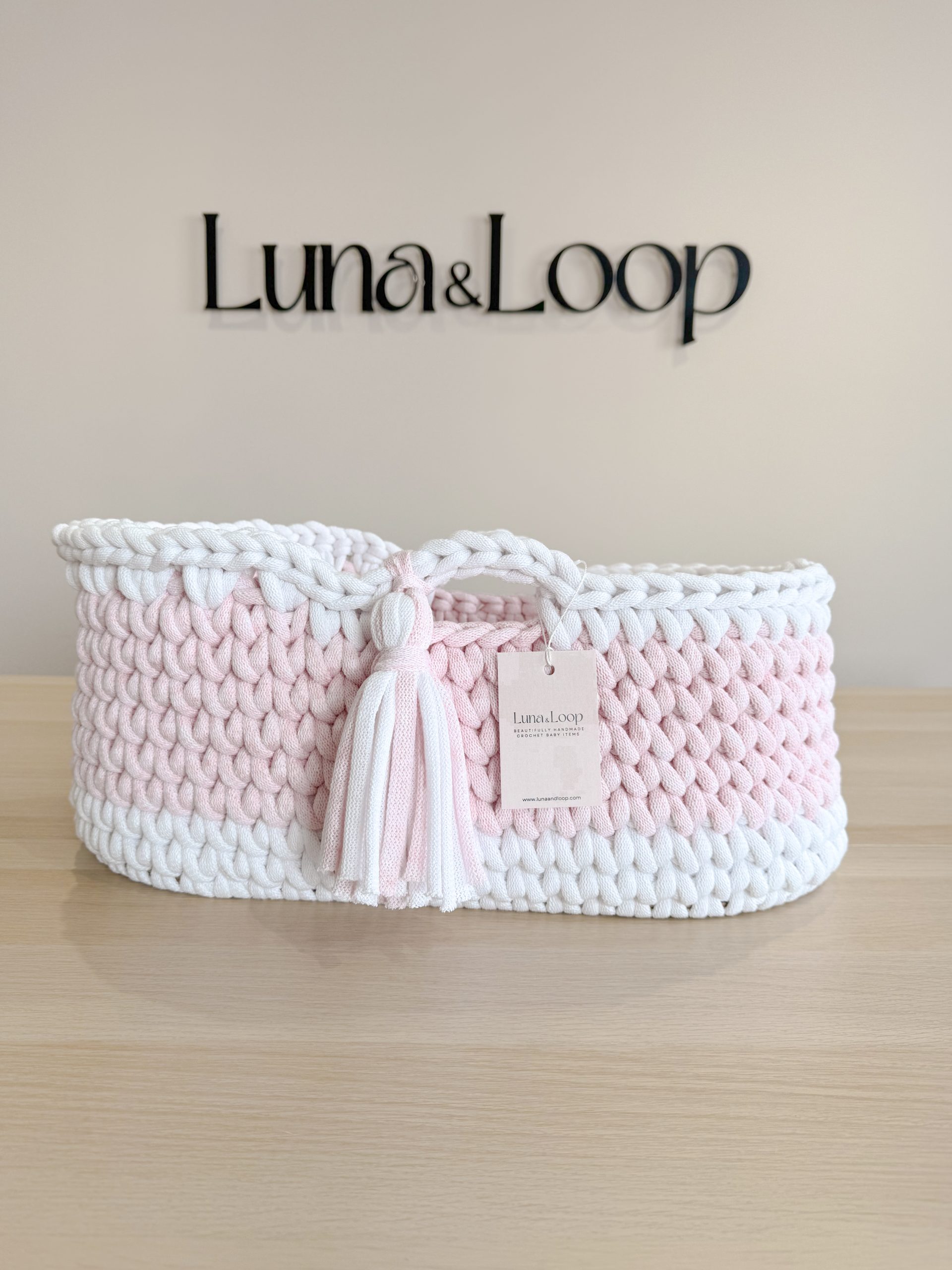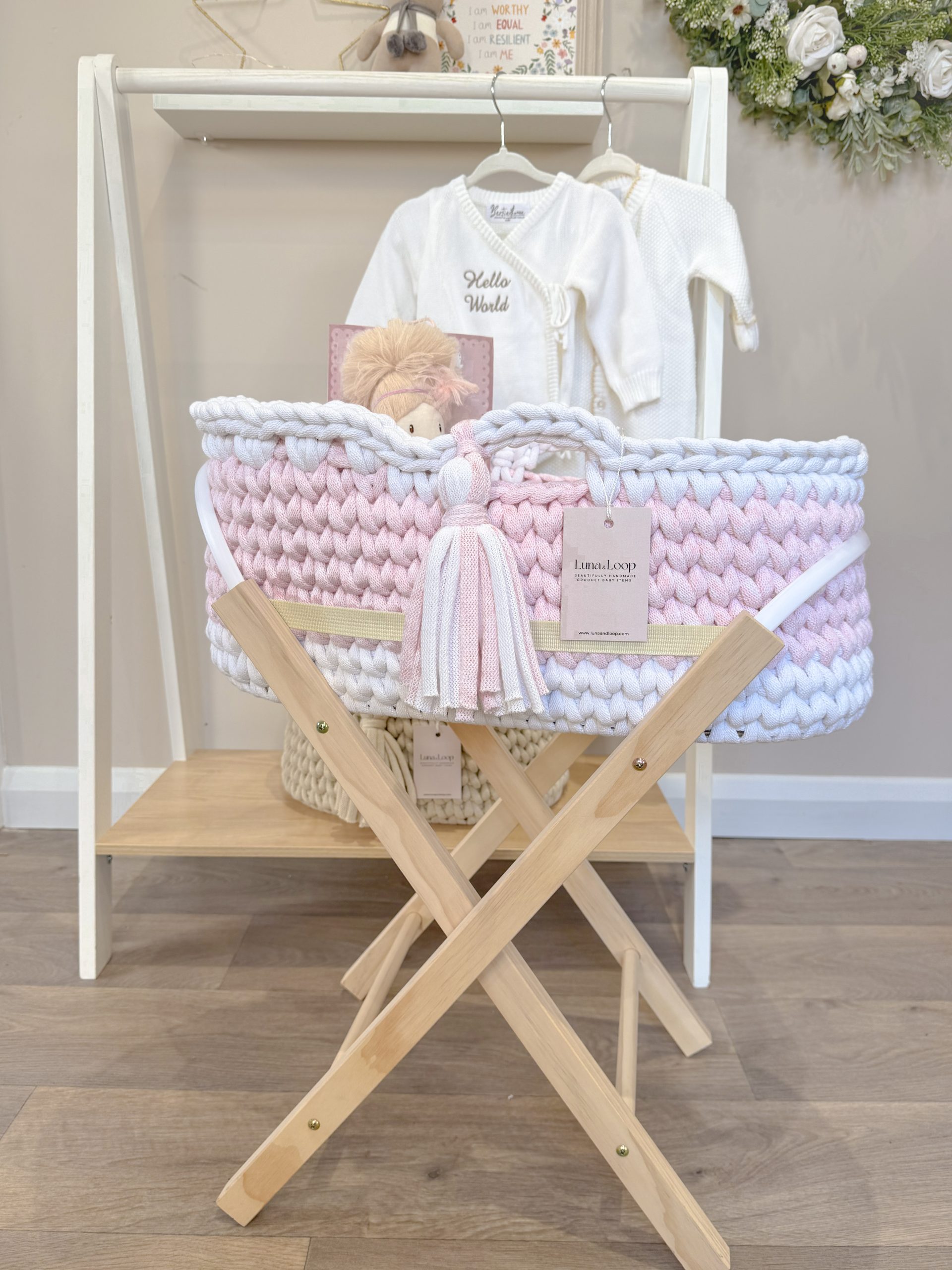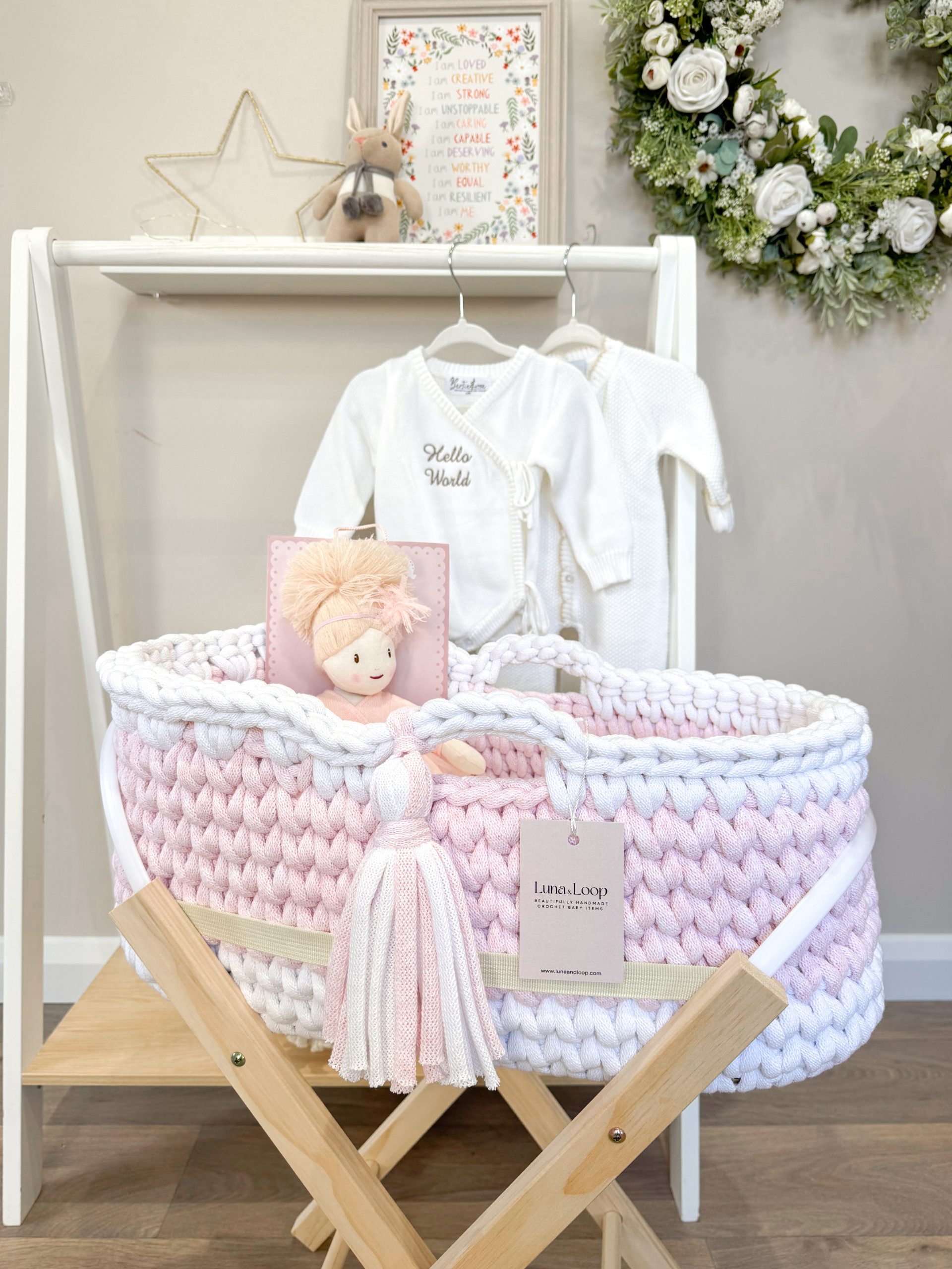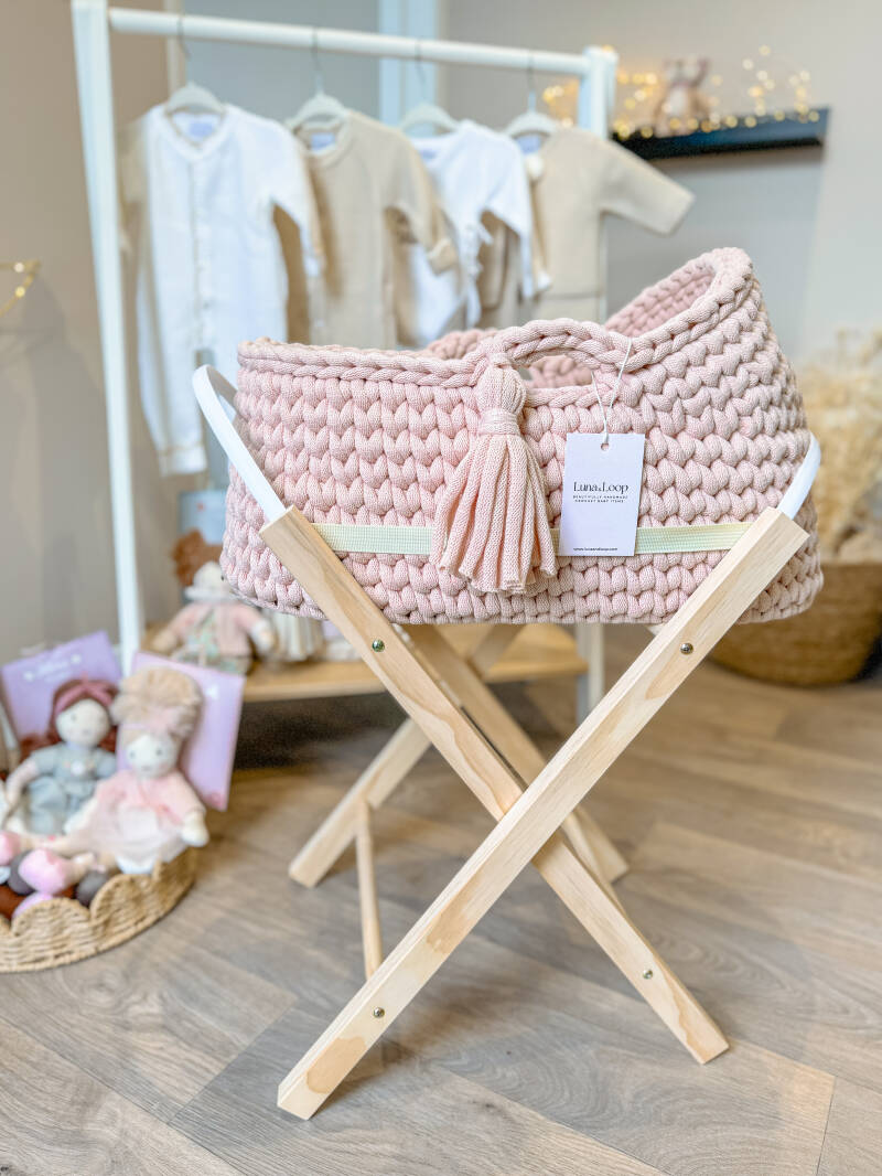 Lovingly handcrafted in Somerset from cord made using 100% recycled cotton, our Dolly Crochet Moses Baskets are designed for hours of nurturing, gentle play.