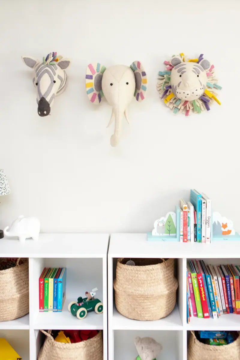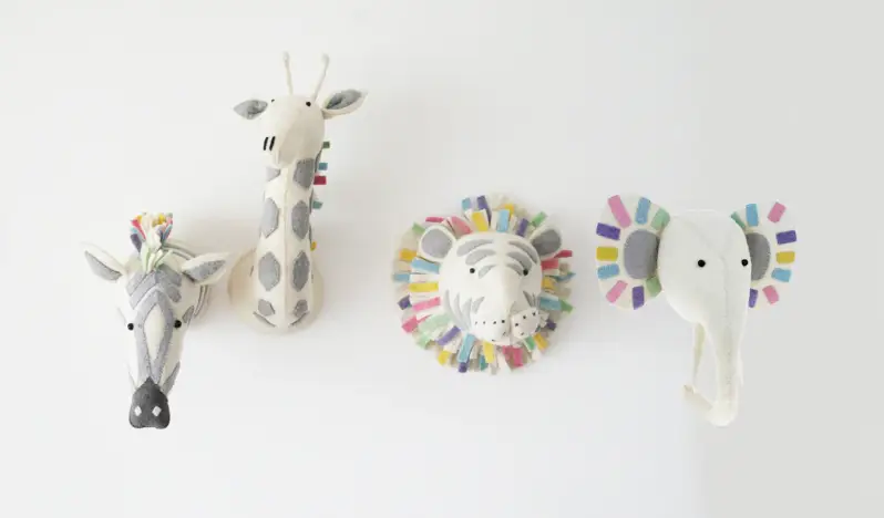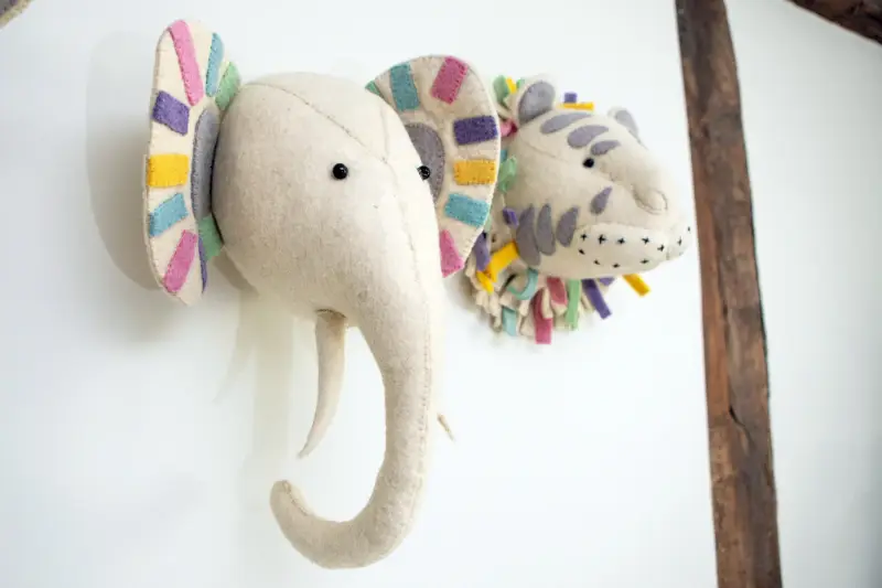 Handcrafted Made from organic woolThe original felt animal headsDimensions: H 35cm W 33cm D 30cm Meet the Pastel Safari Elephant head! The pastel colours make it the perfect addition to a nursery or kids bedroom!