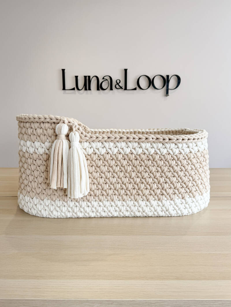 Welcome your little one into the world with our beautifully handcrafted Crochet Moses basket, made from soft, natural recycled cotton yarn. Thoughtfully designed to offer a cosy and safe space for your newborn, it’s a charming blend of traditional craftsmanship and modern sustainability. Certified by OEKO-TEX® Standard 100, you can rest assured no harmful substances have been used in the production or dyeing of the cotton – only the gentlest materials for your baby’s skin.