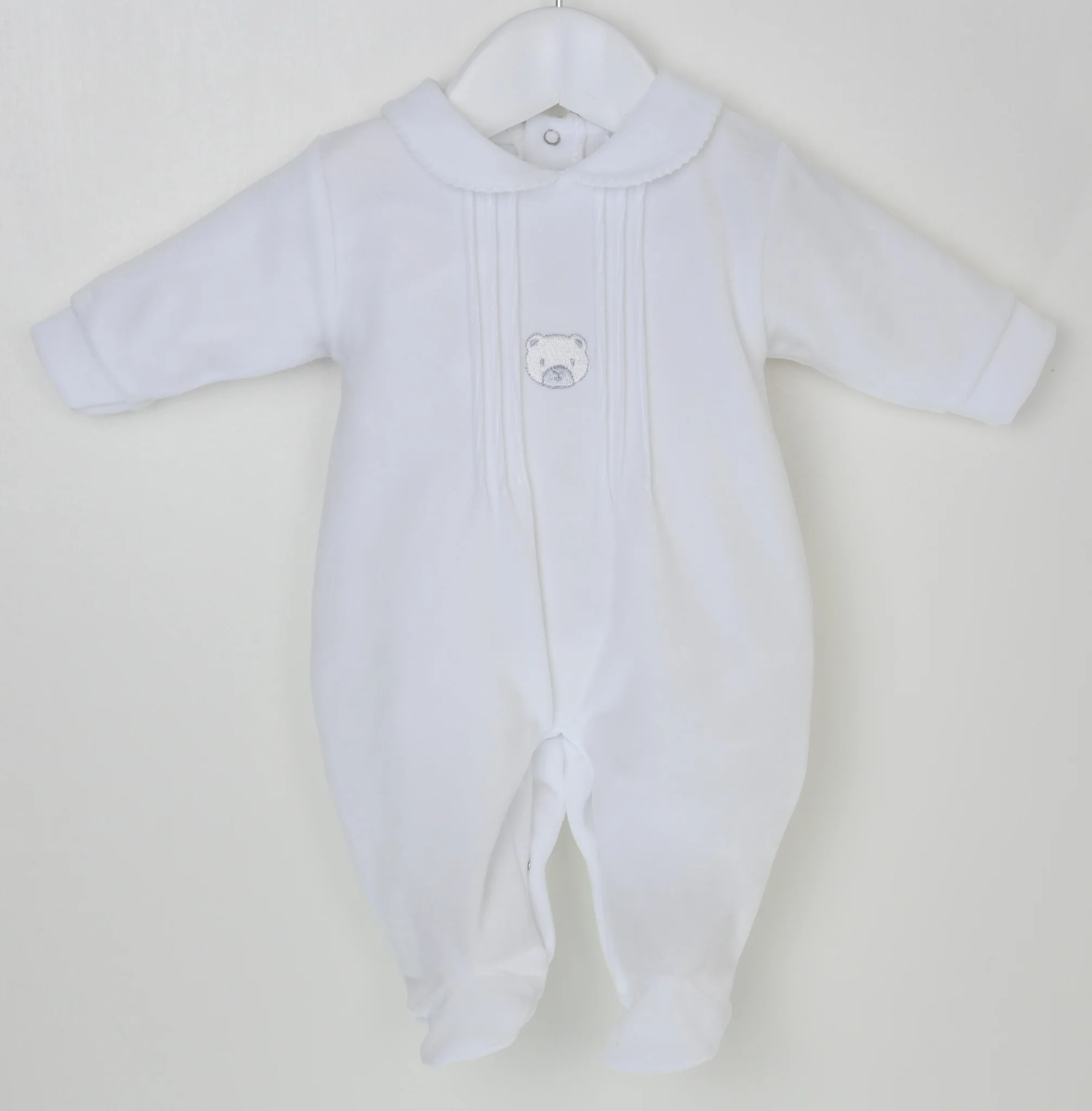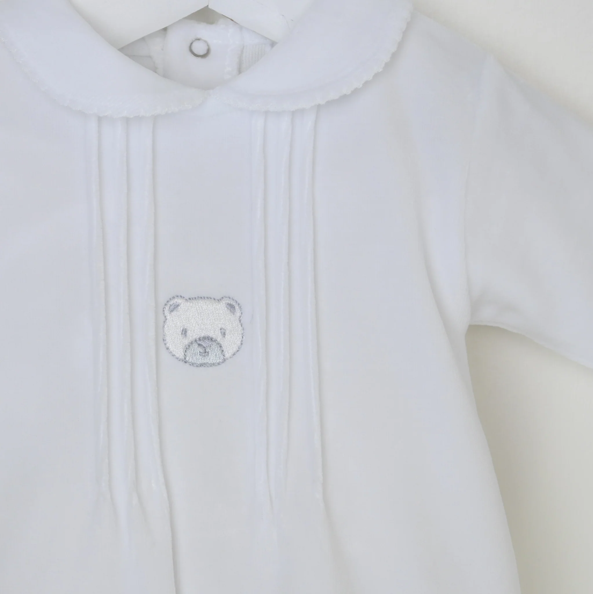 Beautifully crafted in supersoft 80% cotton velour, this charming sleepsuit is as gentle on delicate skin as it is lovely to look at. The chest features classic pintuck detailing for an elegant, timeless finish, while the front is adorned with the cutest little embroidered teddy face—sure to bring a smile to everyone who sees it.
