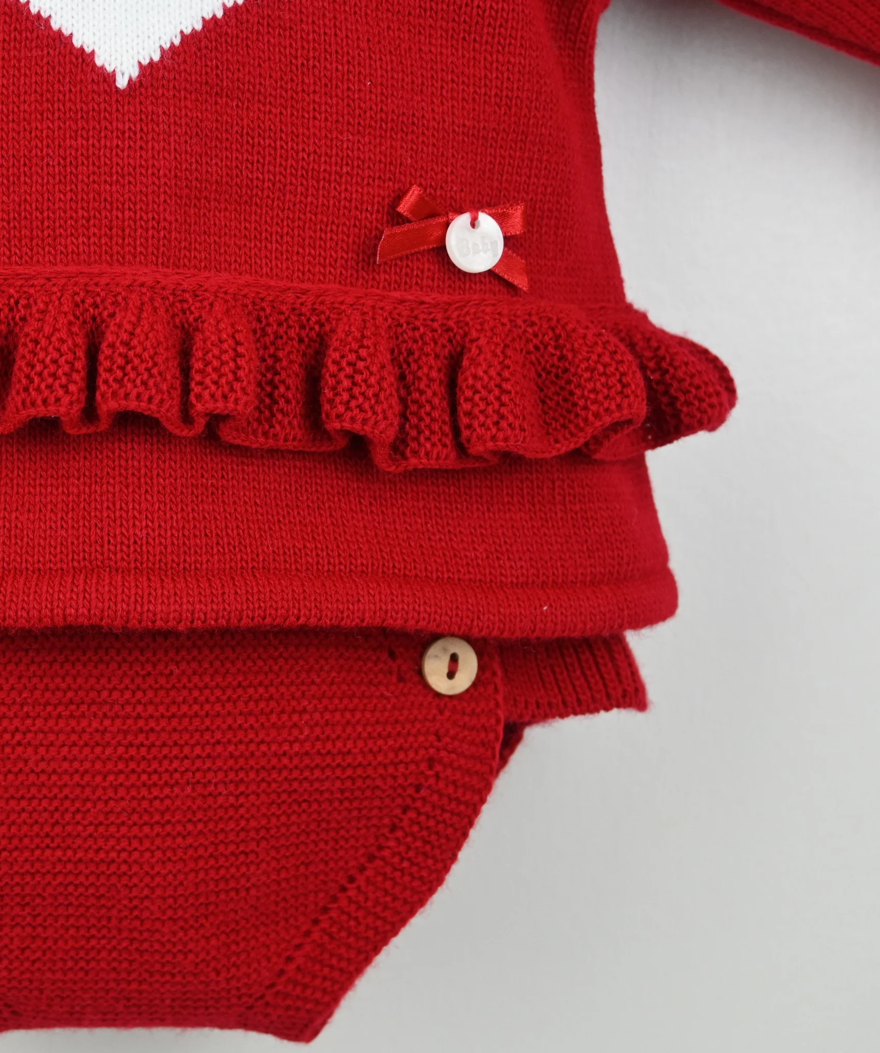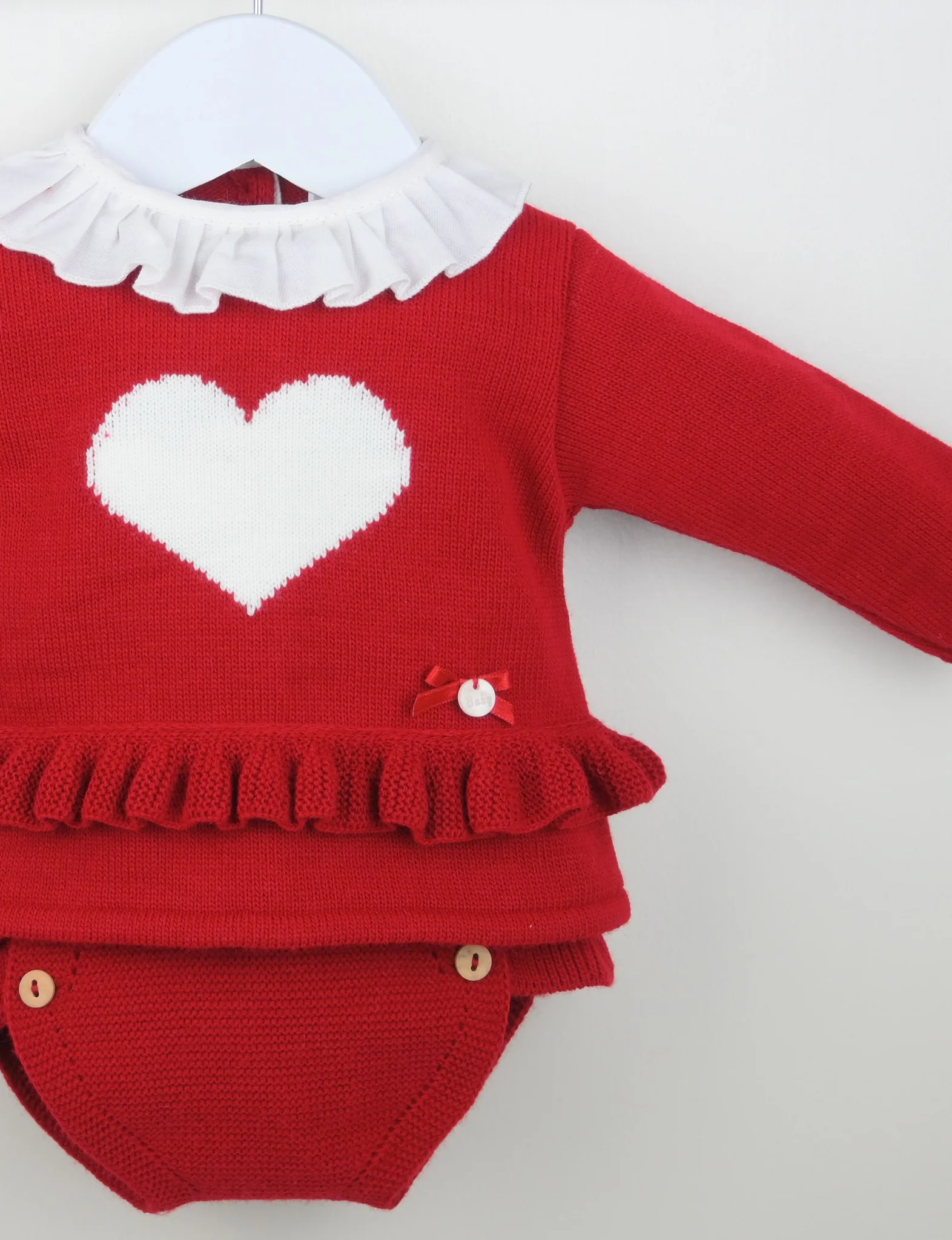 An exquisite little two-piece set, beautifully crafted in a super-soft rich red knit. The cosy long-sleeved top features a delicate frilled collar, a sweet ivory heart motif on the front, and an elegant knitted frill finished with a dainty bow appliqué—a truly charming combination.