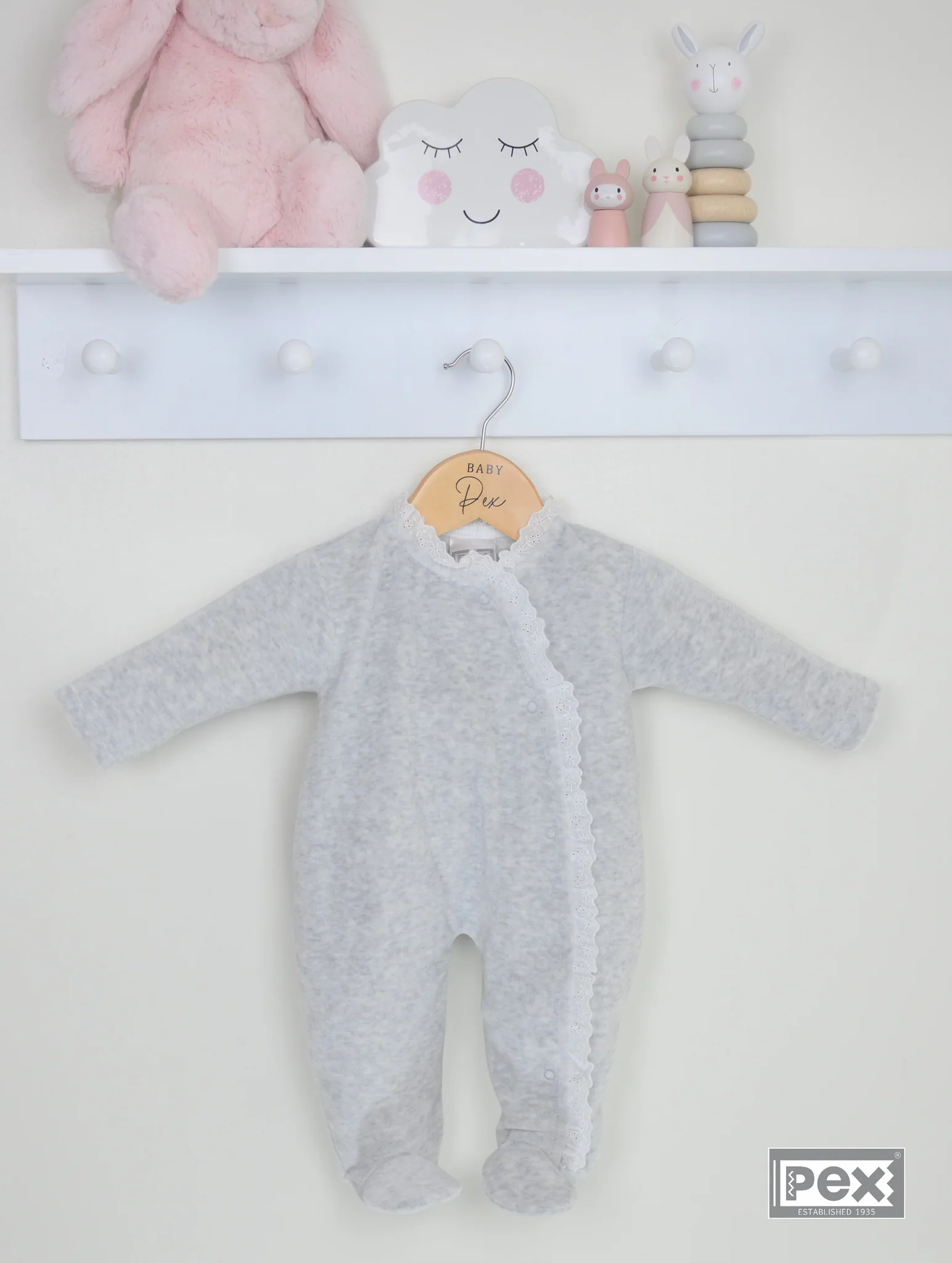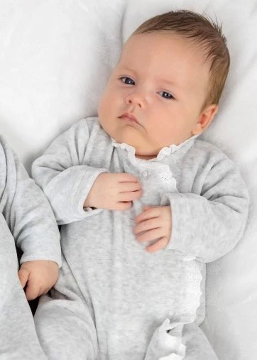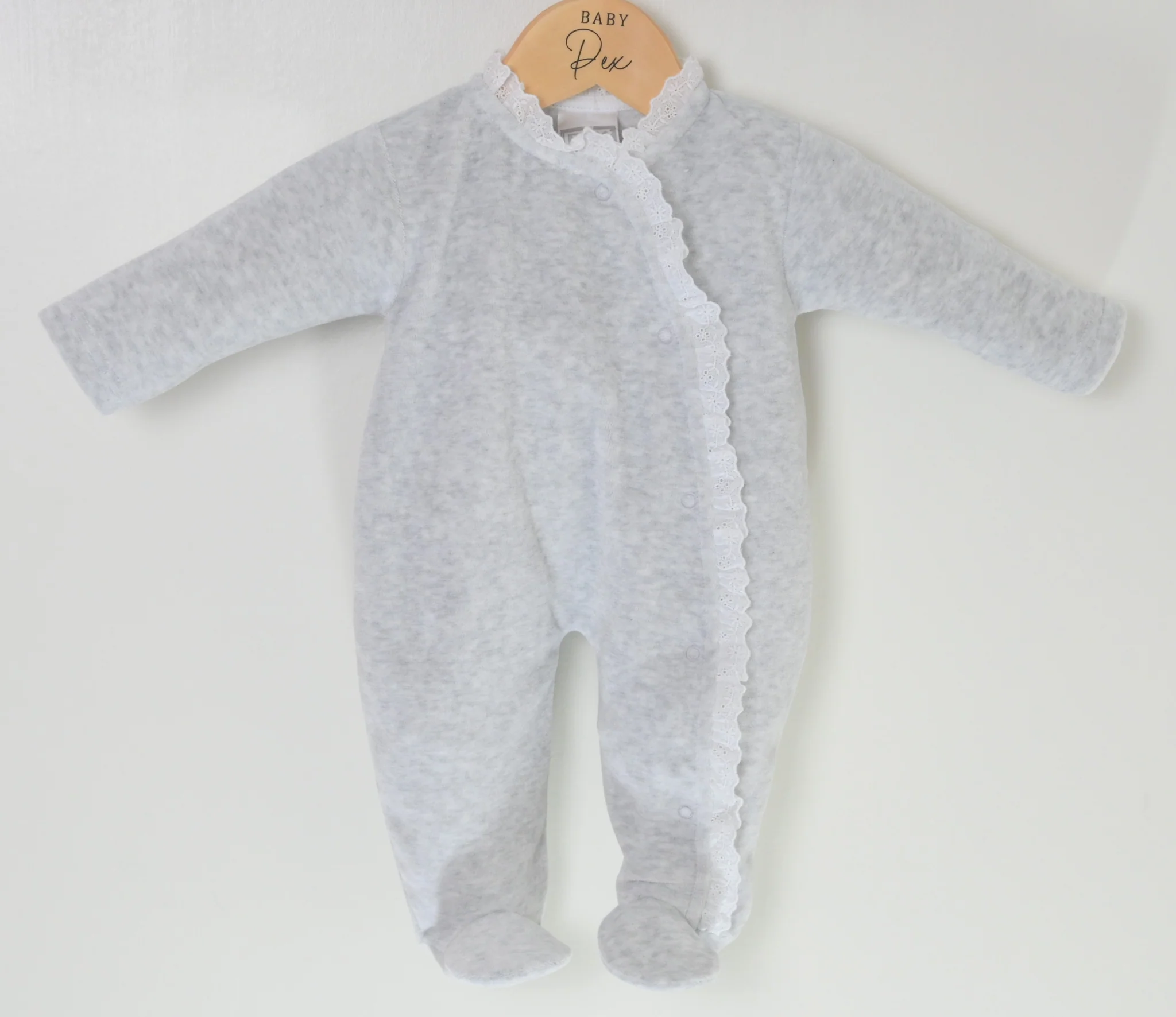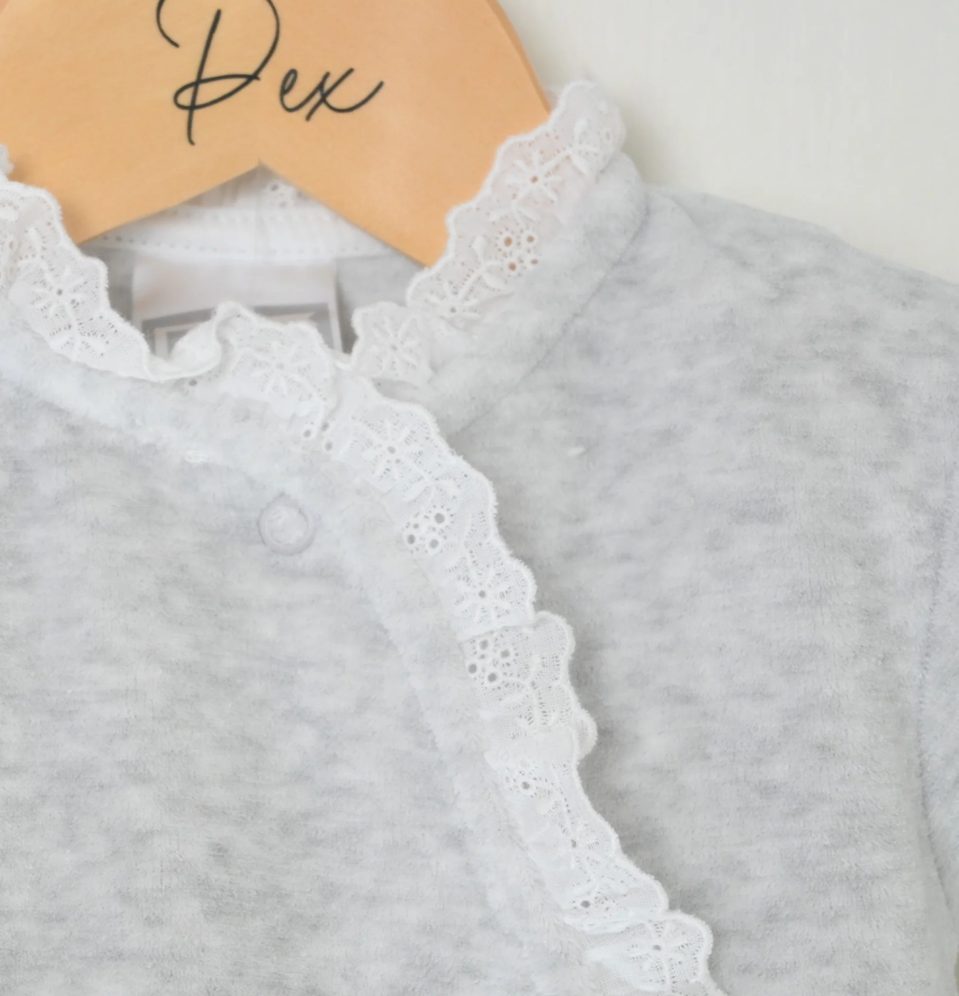 Made from beautifully soft pure grey velour with 80% cotton, this sleepsuit combines comfort with understated elegance. The delicate broderie lace trim around the neckline and down the front edge adds a timeless, graceful touch.