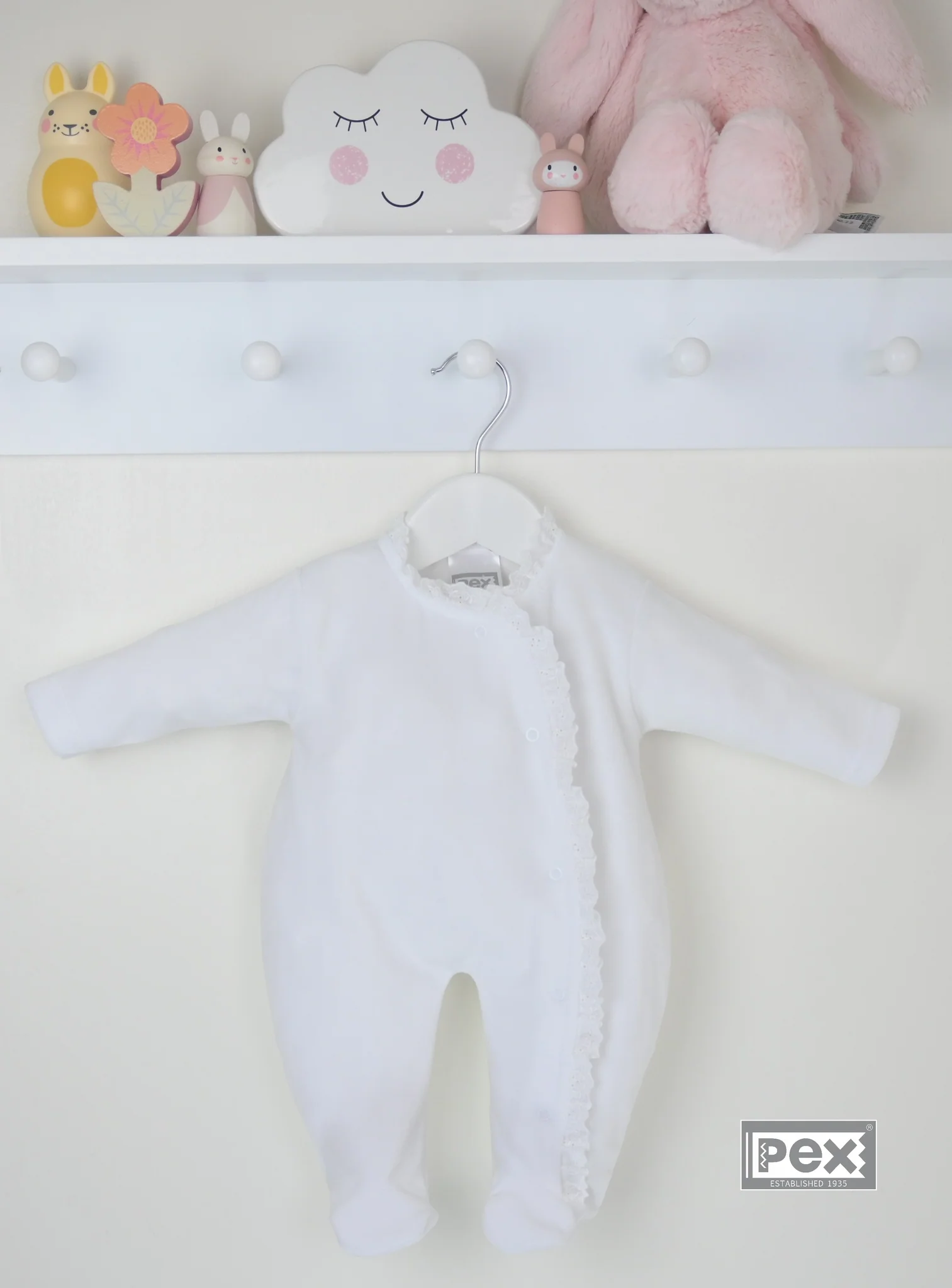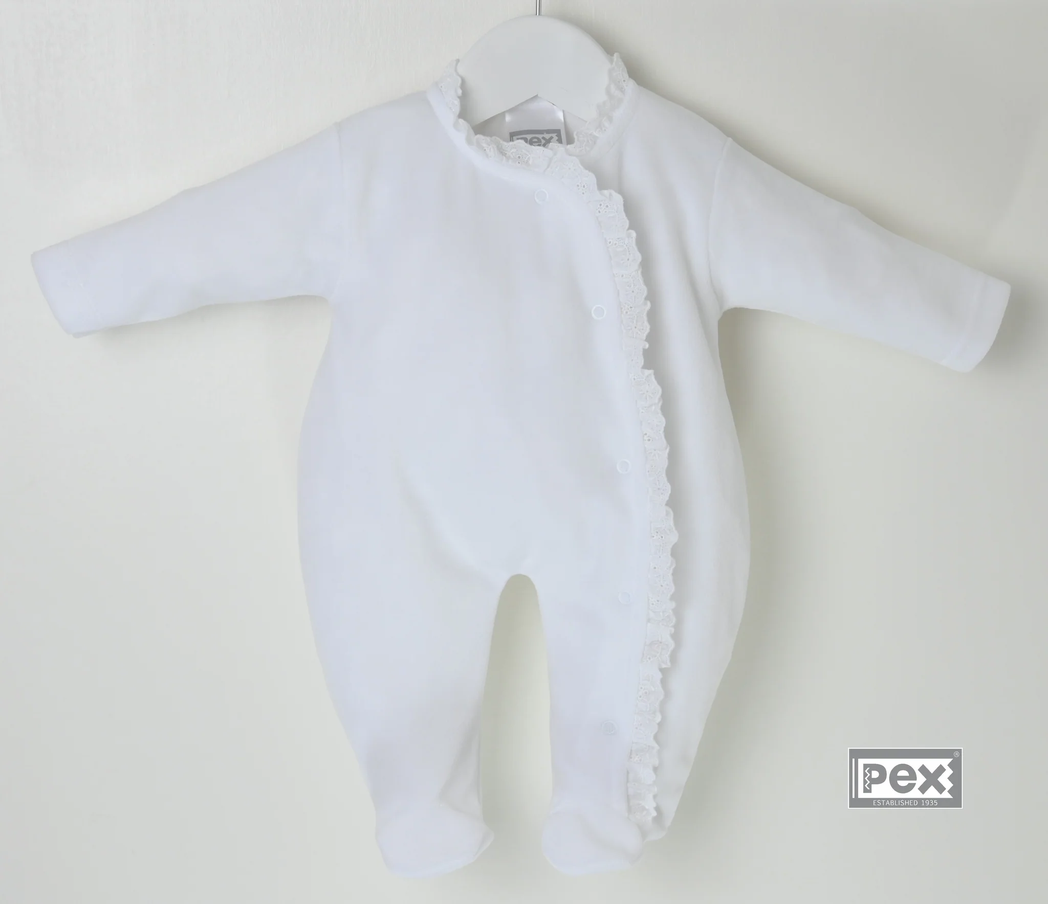 Made from beautifully soft pure white velour with 80% cotton, this sleepsuit combines comfort with understated elegance. The delicate broderie lace trim around the neckline and down the front edge adds a timeless, graceful touch.