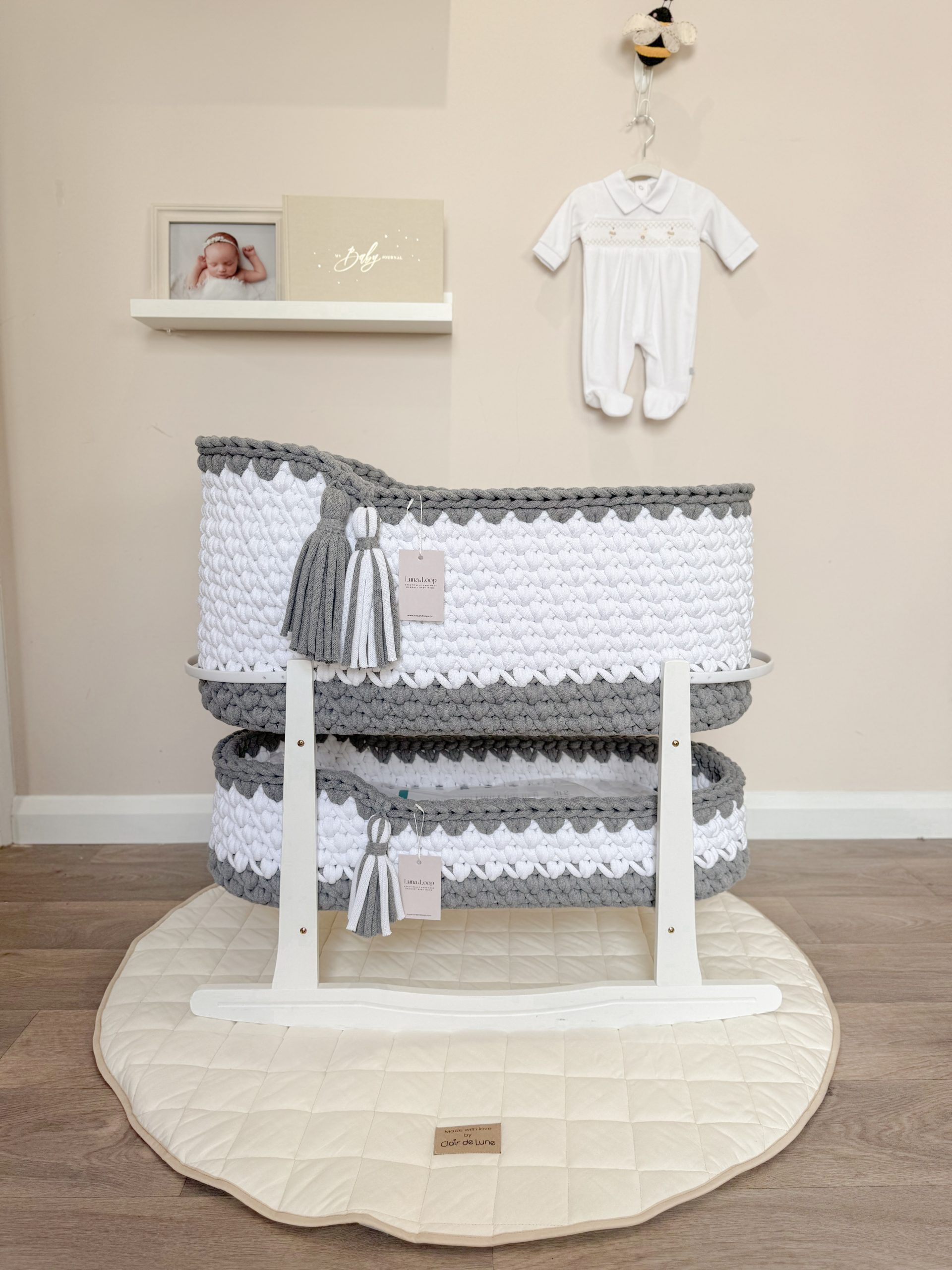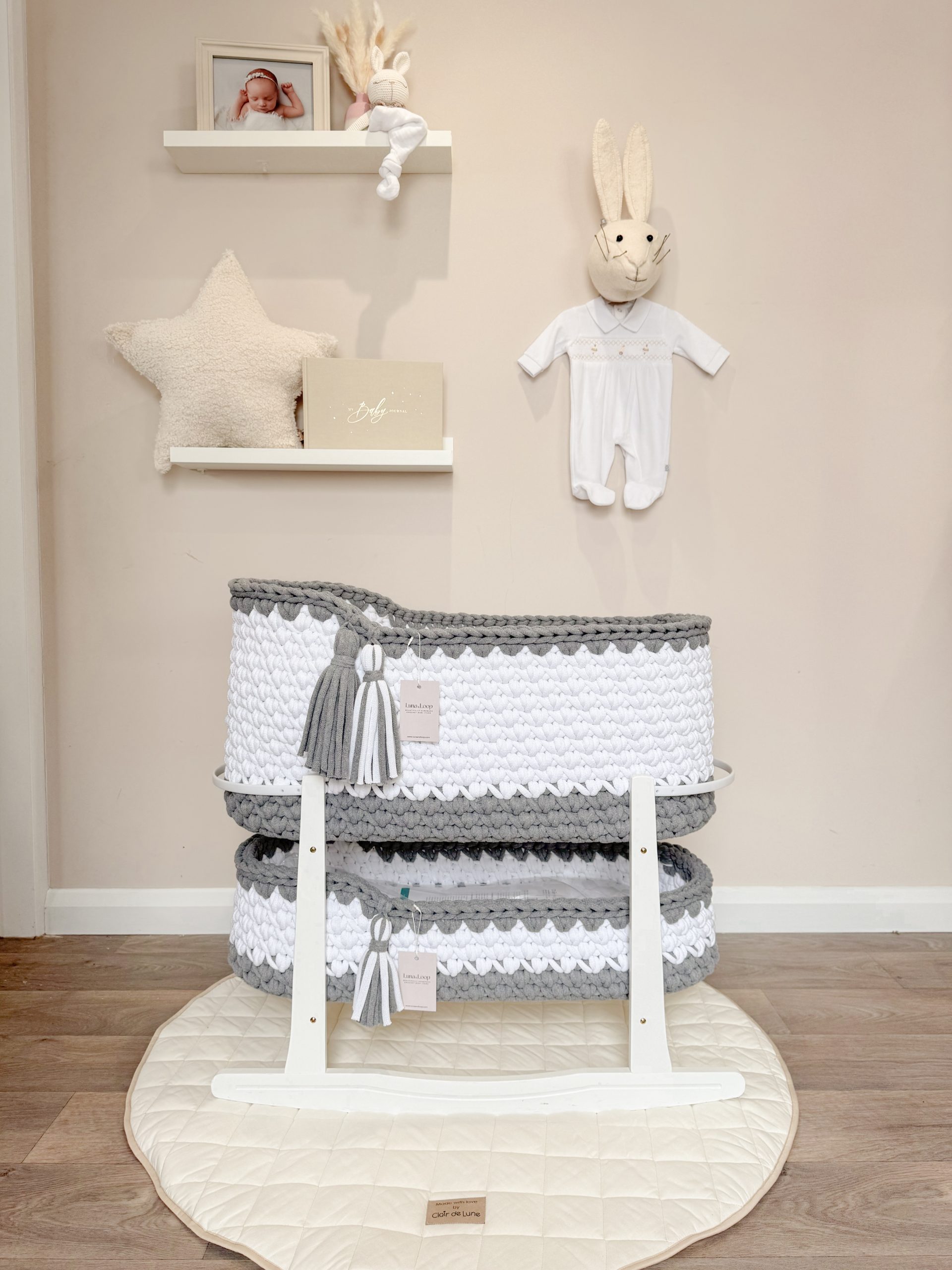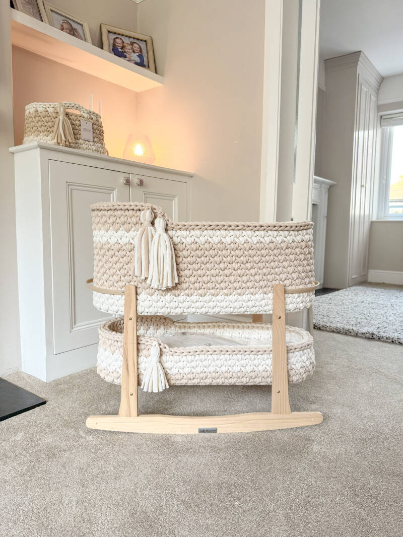 What’s in the box: A Half Hood Crochet Moses basket, Half Hood Crochet Changing Basket, Crochet Nappy Caddy, 2x hypoallergenic mattress, two fitted cotton sheets, a waterproof mattress protector, and your choice of rocking stand.