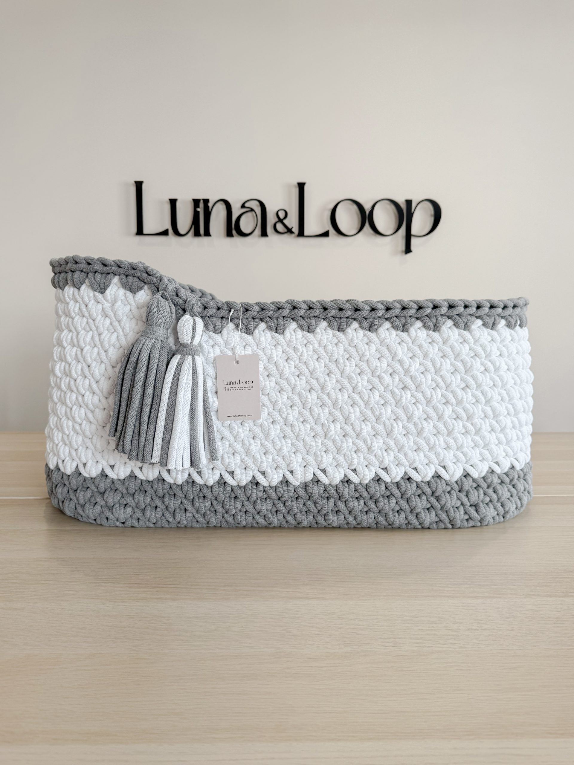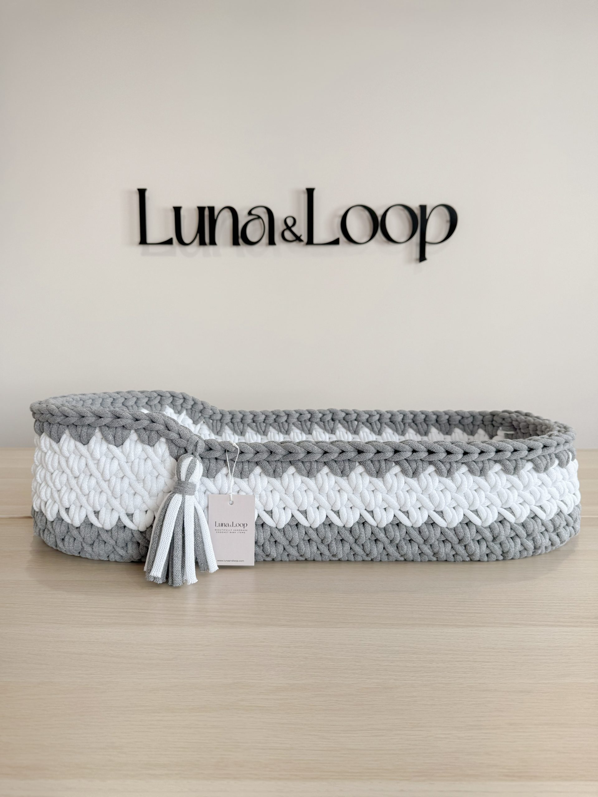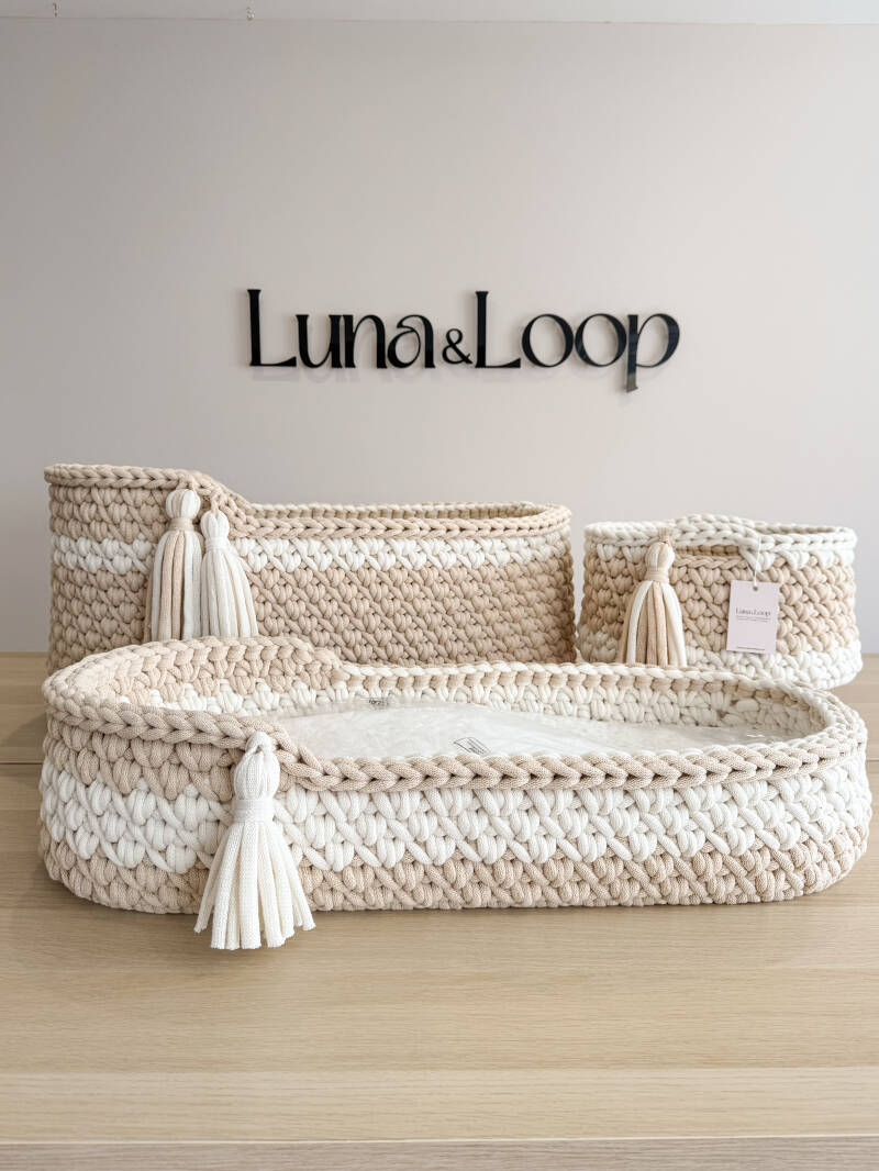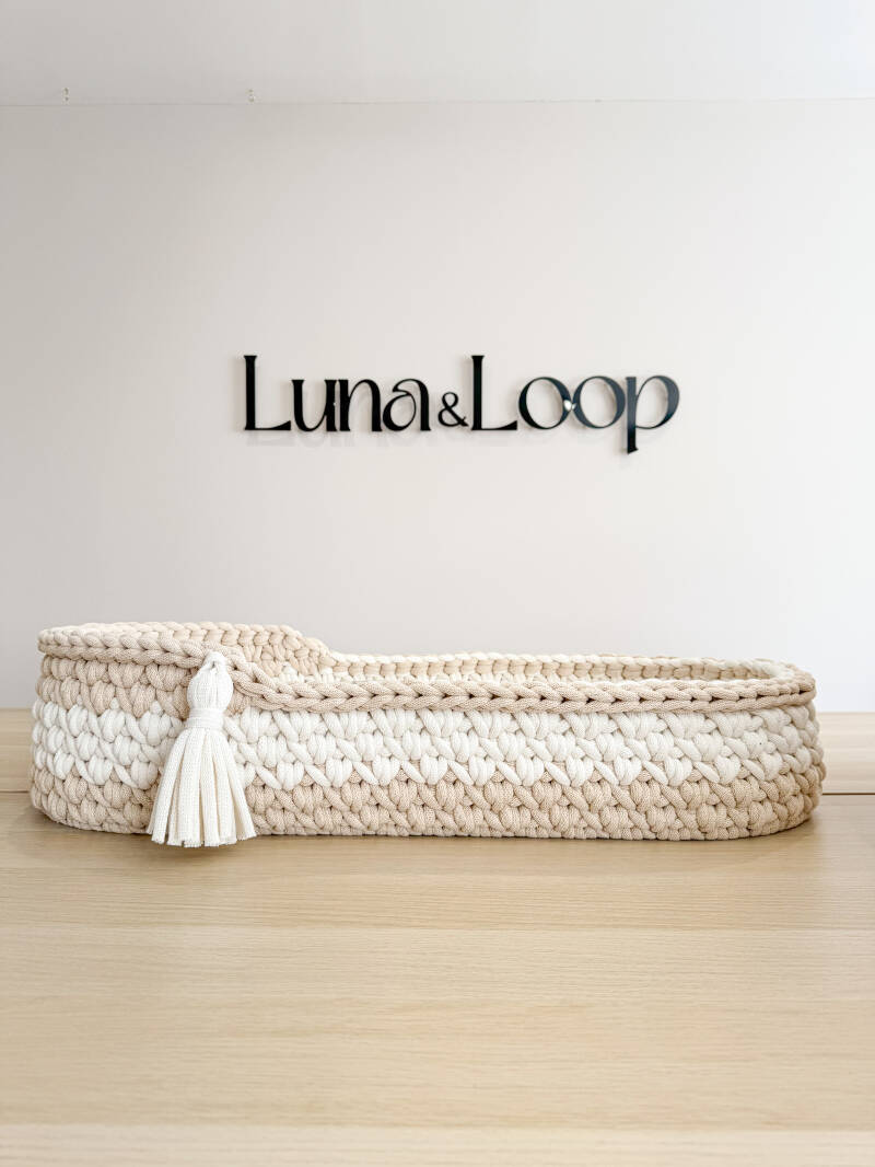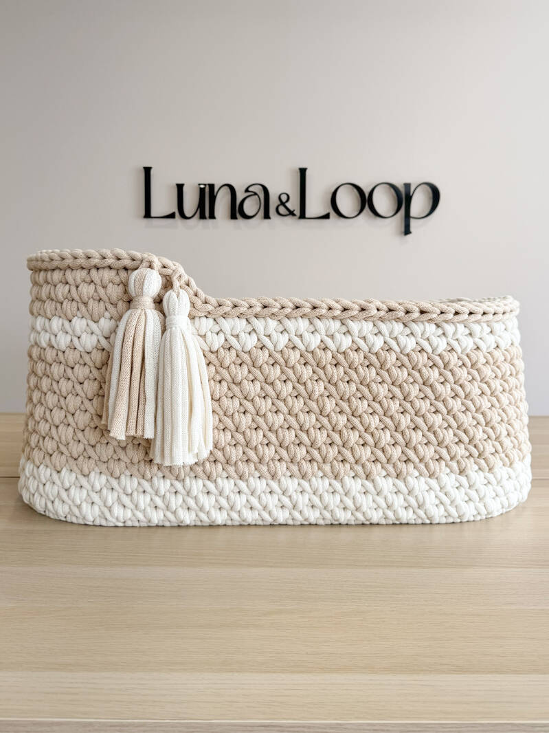 Welcome your little one into the world with our beautifully handcrafted Crochet Moses basket, made from soft, natural recycled cotton yarn. Thoughtfully designed to offer a cosy and safe space for your newborn, it’s a charming blend of traditional craftsmanship and modern sustainability. Certified by OEKO-TEX® Standard 100, you can rest assured no harmful substances have been used in the production or dyeing of the cotton – only the gentlest materials for your baby’s skin.