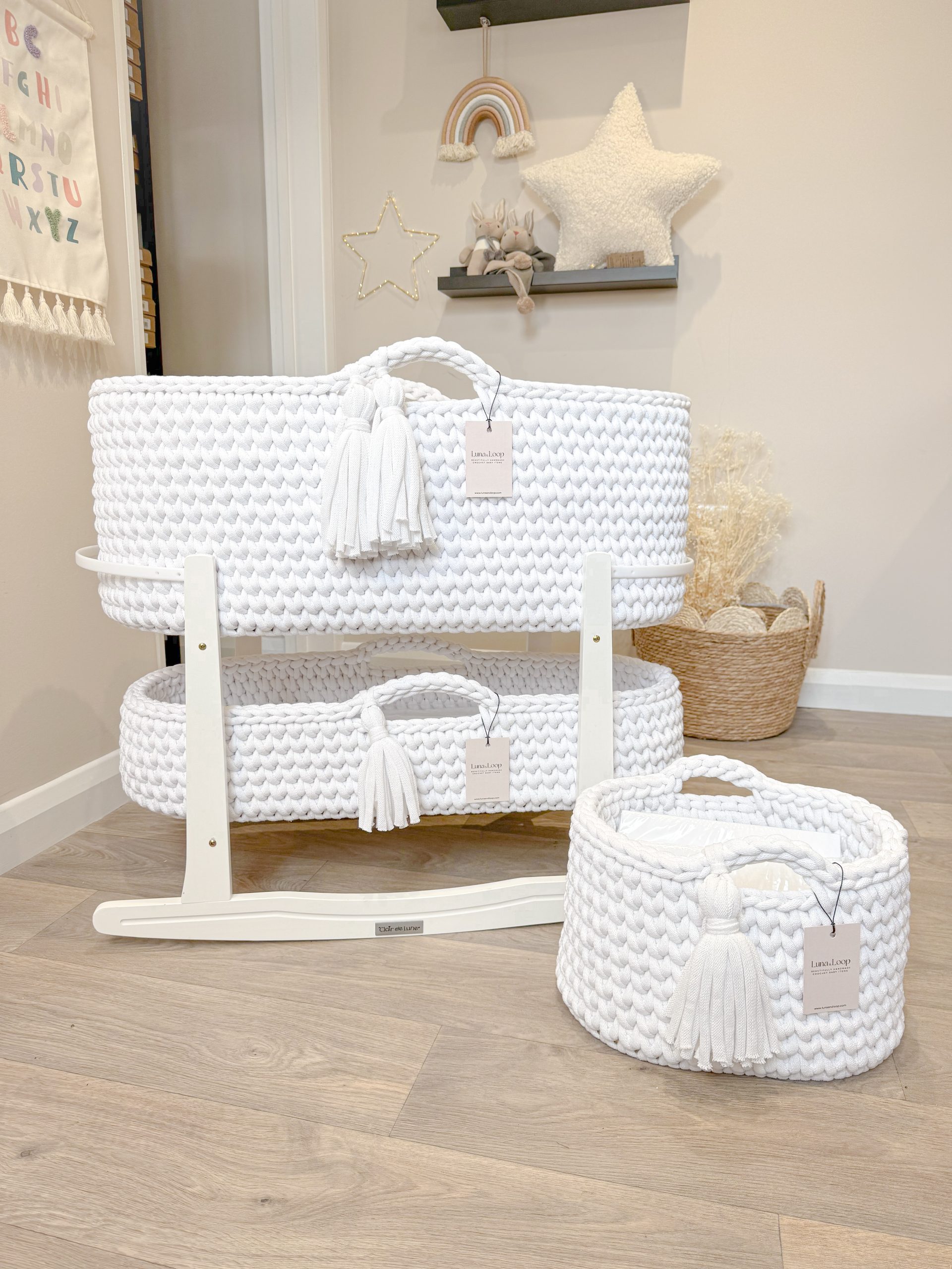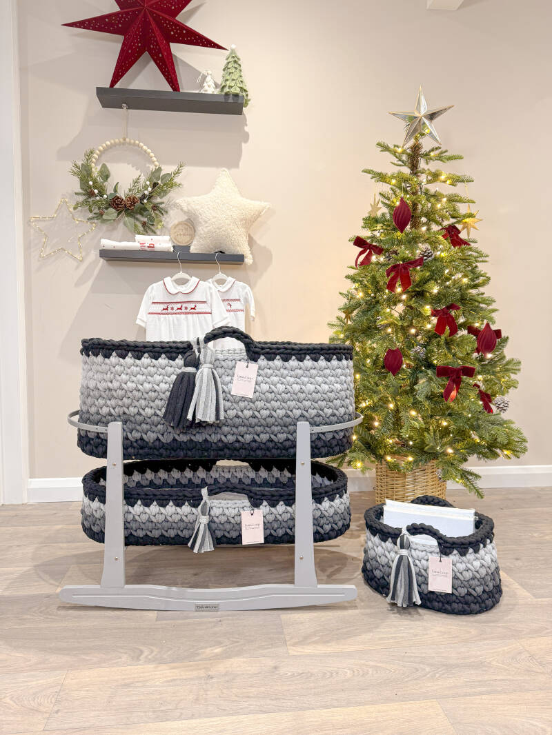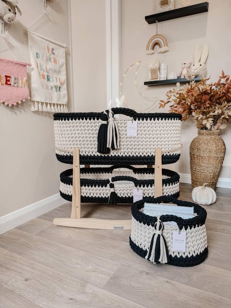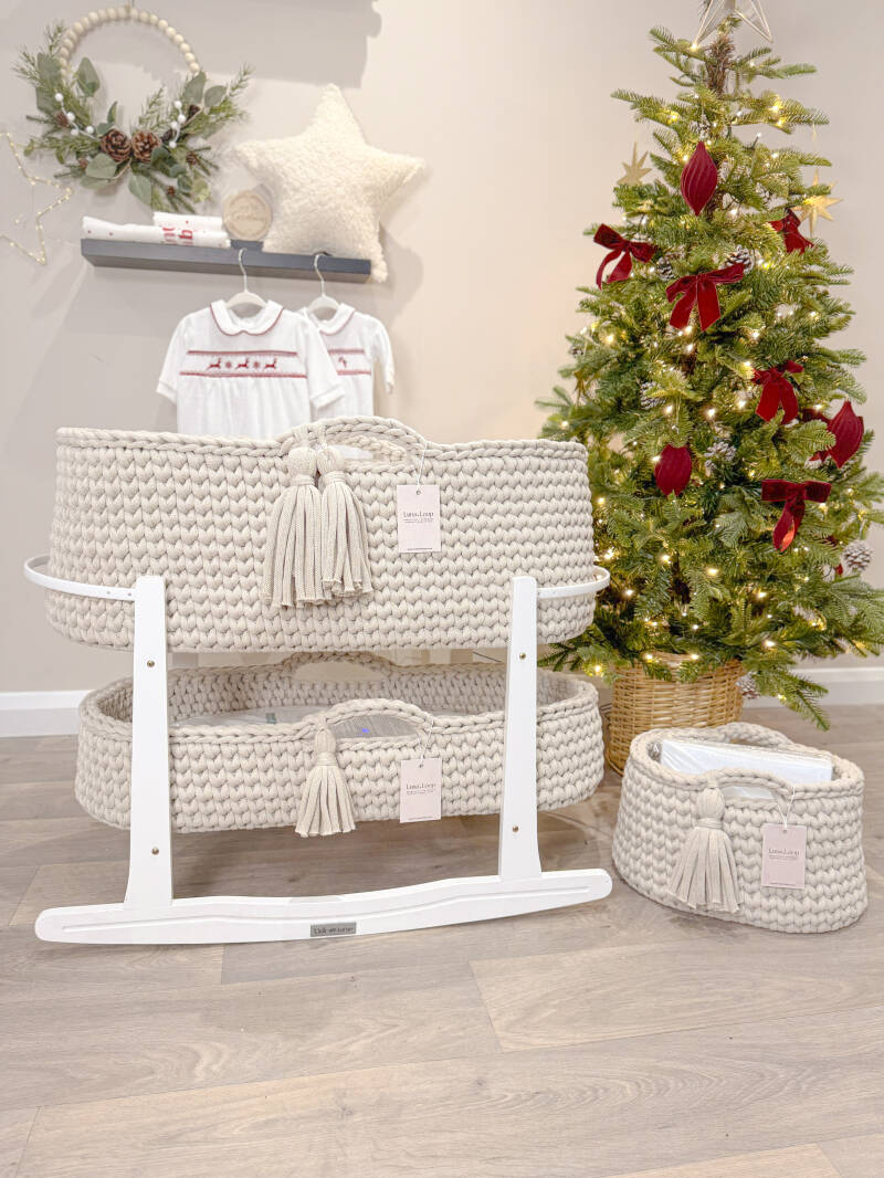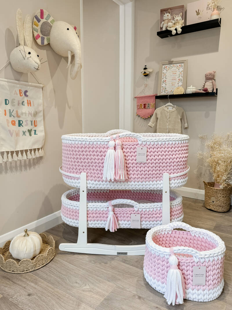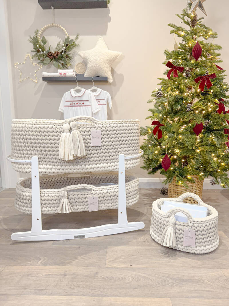 What’s in the box: A Crochet Moses basket, Crochet Changing Basket, Crochet Nappy Caddy, 2x hypoallergenic mattress, two fitted cotton sheets, a waterproof mattress protector, and your choice of rocking stand.