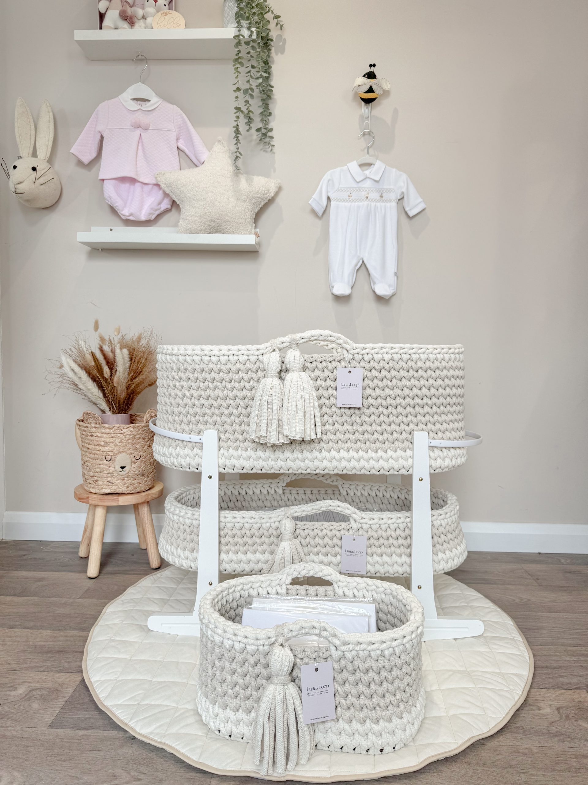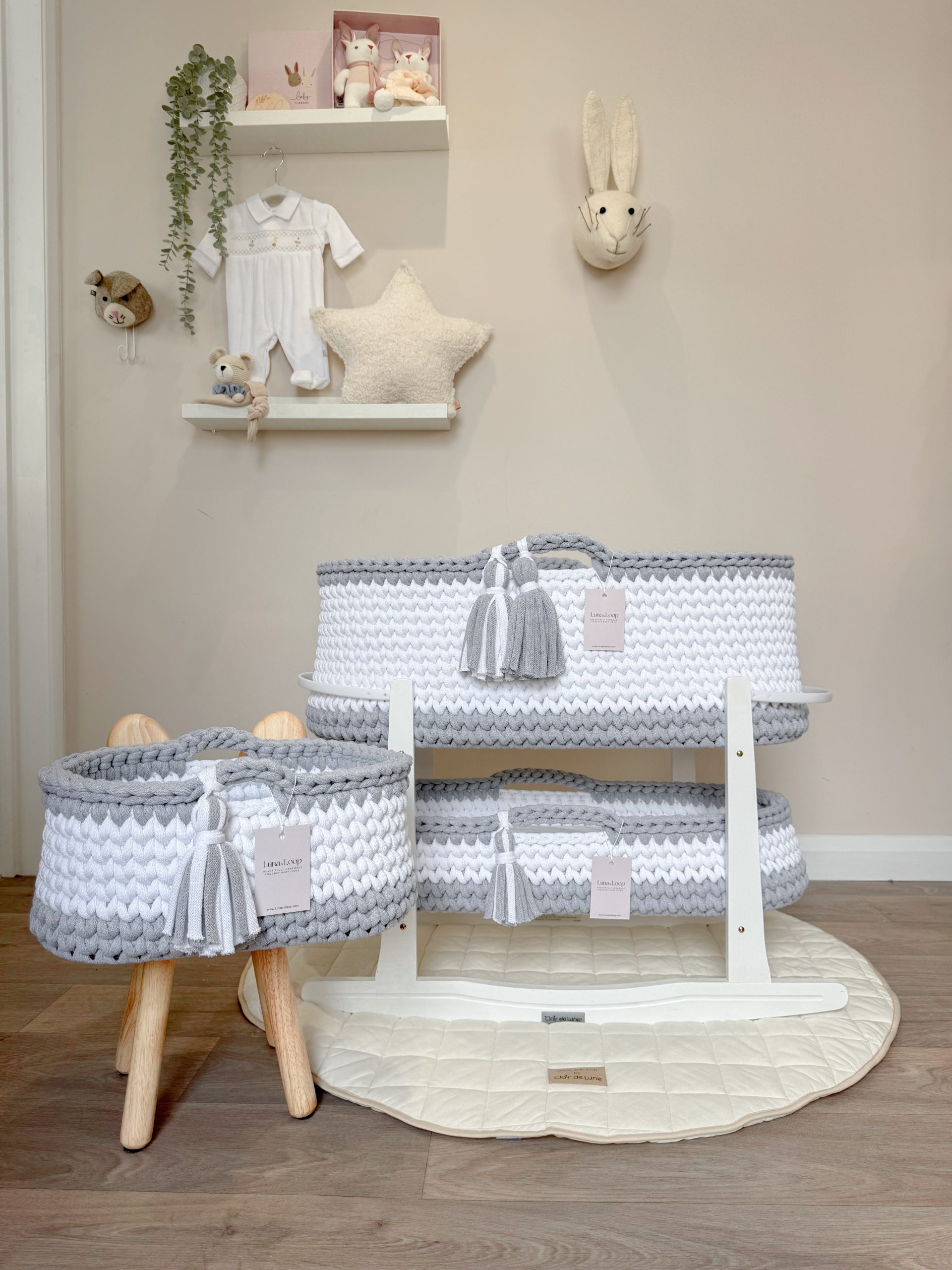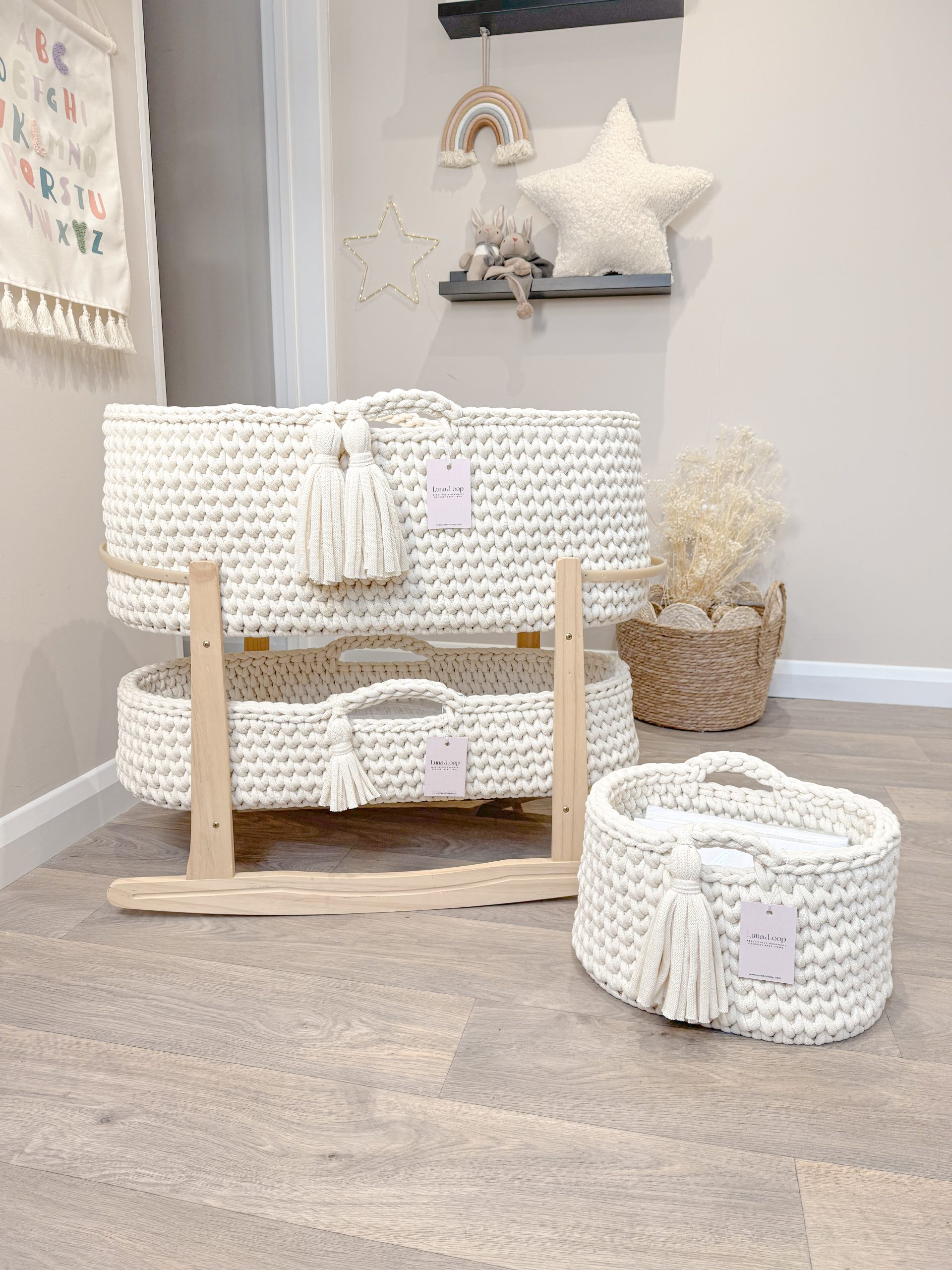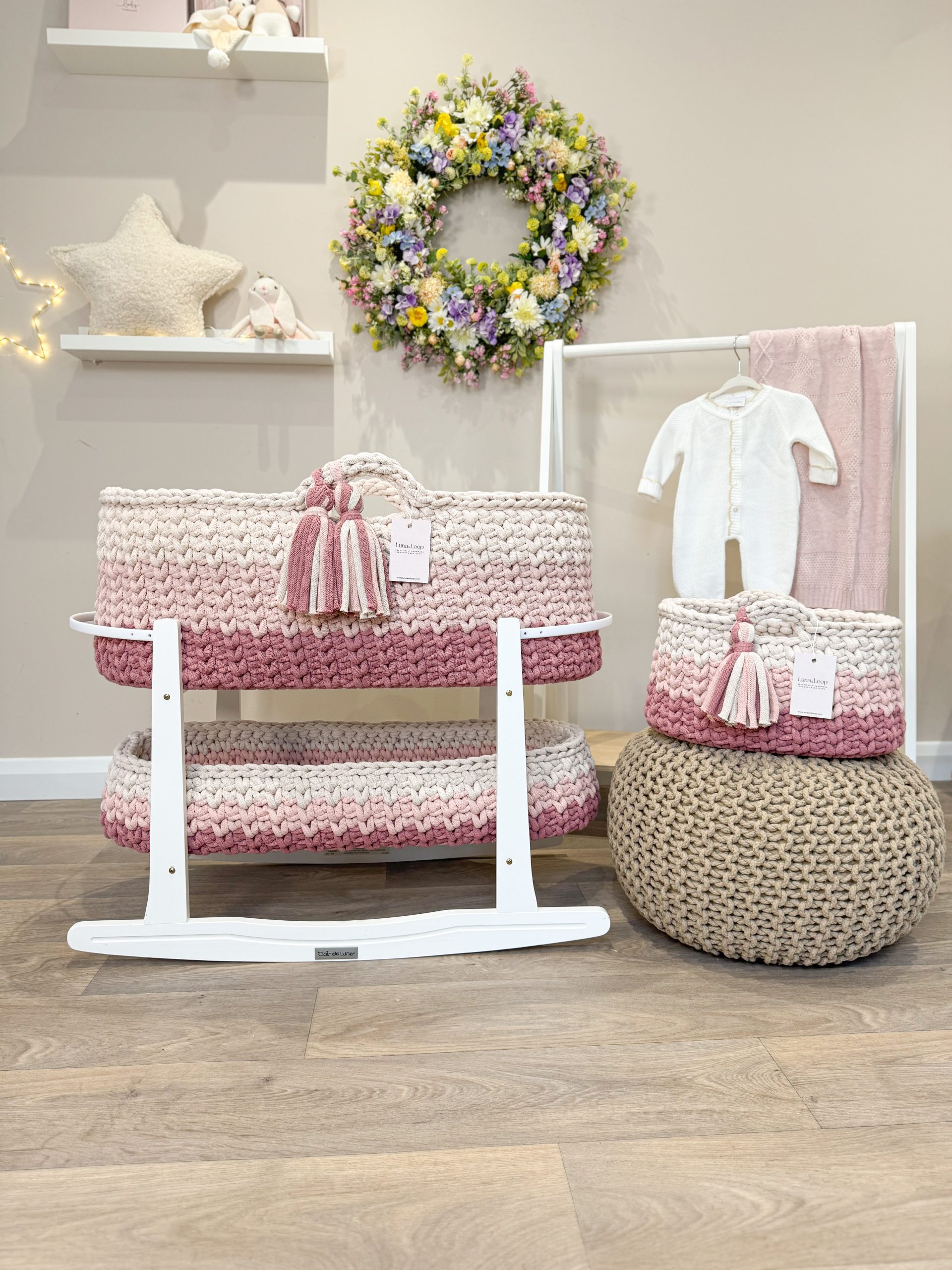 What’s in the box: A Crochet Moses basket, Crochet Changing Basket, Crochet Nappy Caddy, 2x hypoallergenic mattress, two fitted cotton sheets, a waterproof mattress protector, and your choice of rocking stand.