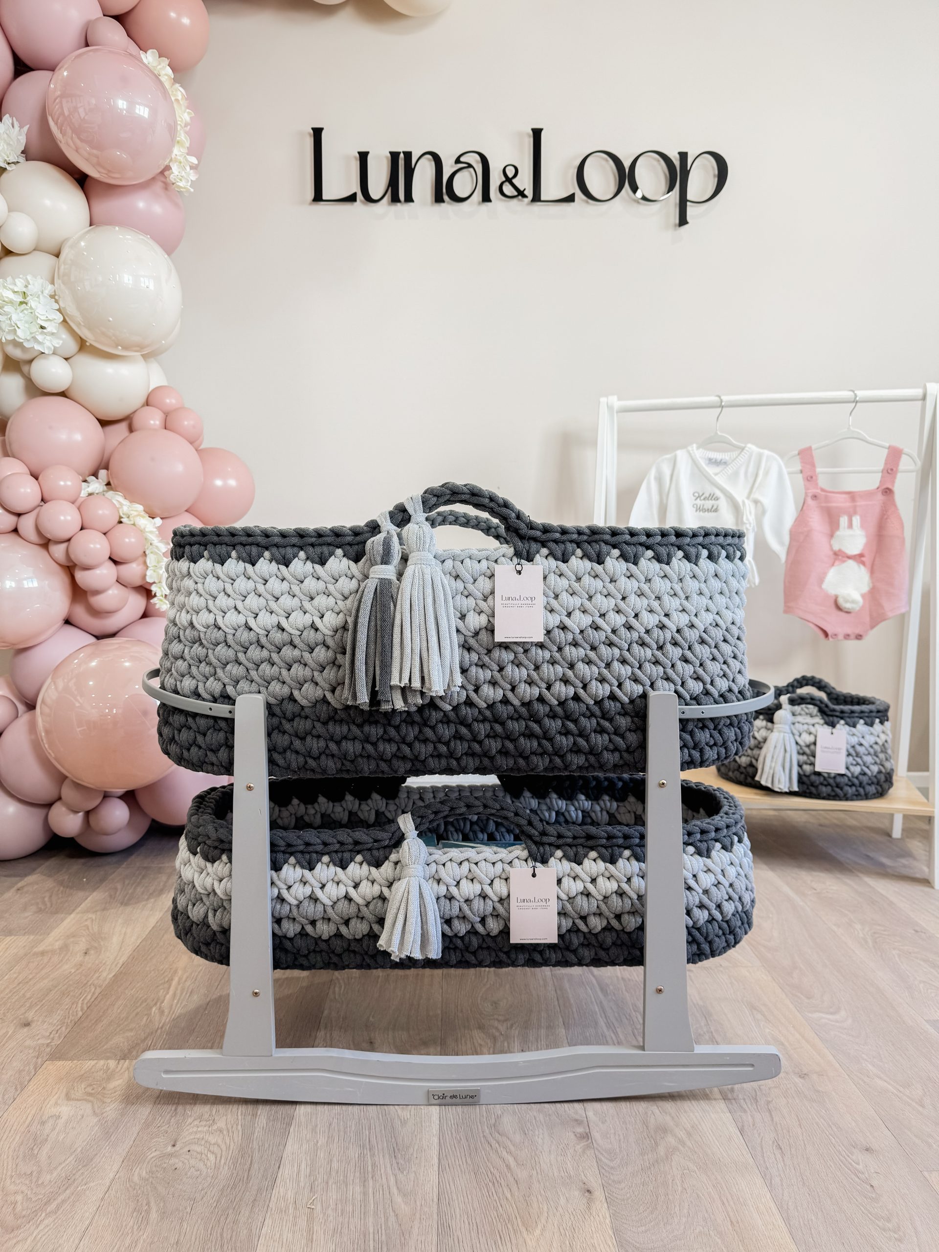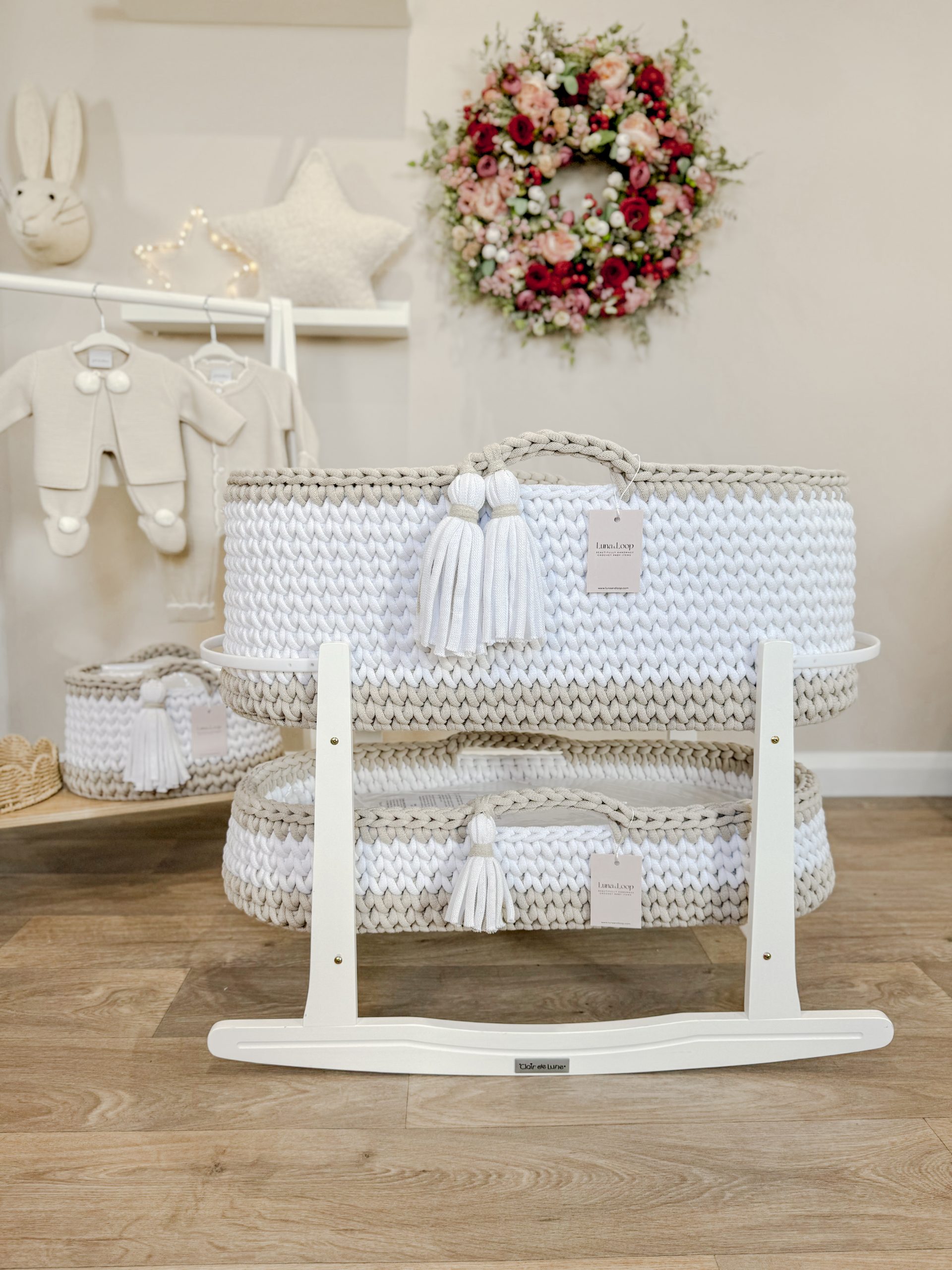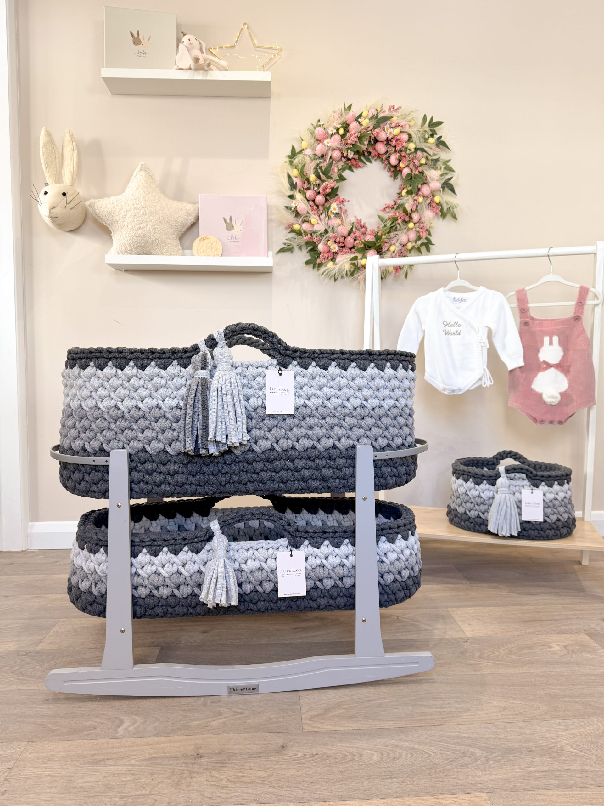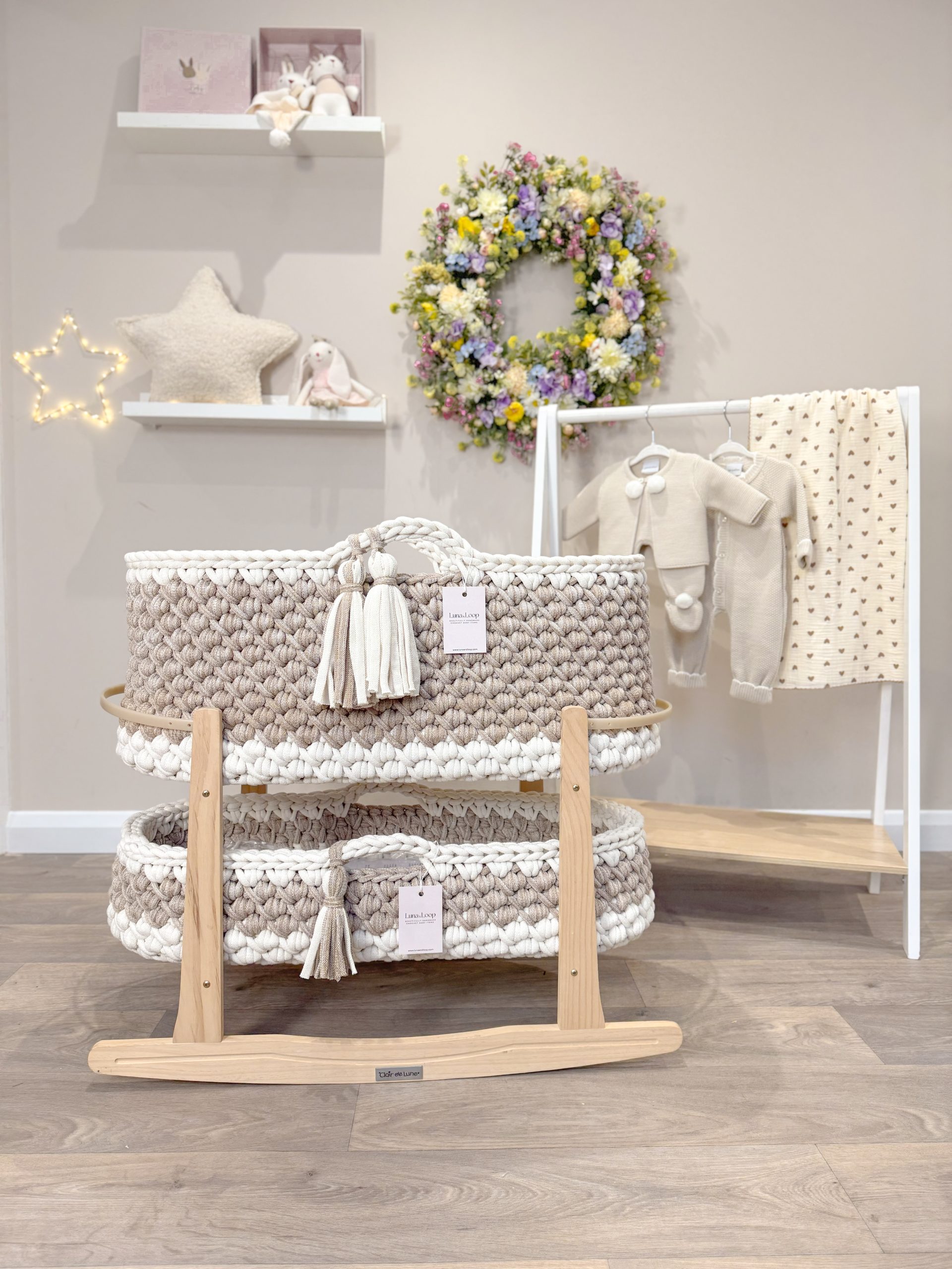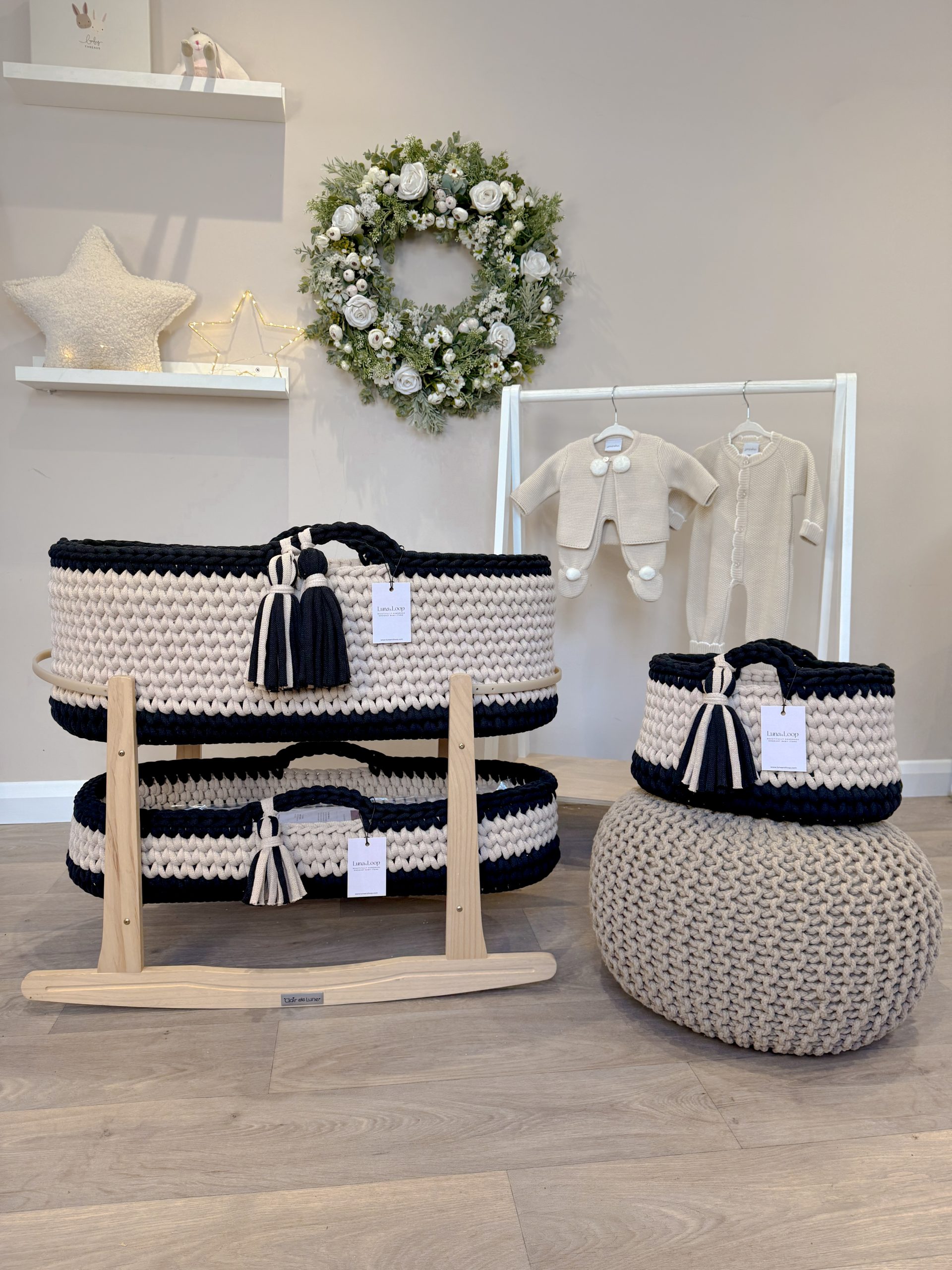 What’s in the box: A Crochet Moses basket, Crochet Changing Basket, Crochet Nappy Caddy, 2x hypoallergenic mattress, two fitted cotton sheets, a waterproof mattress protector, and your choice of rocking stand.