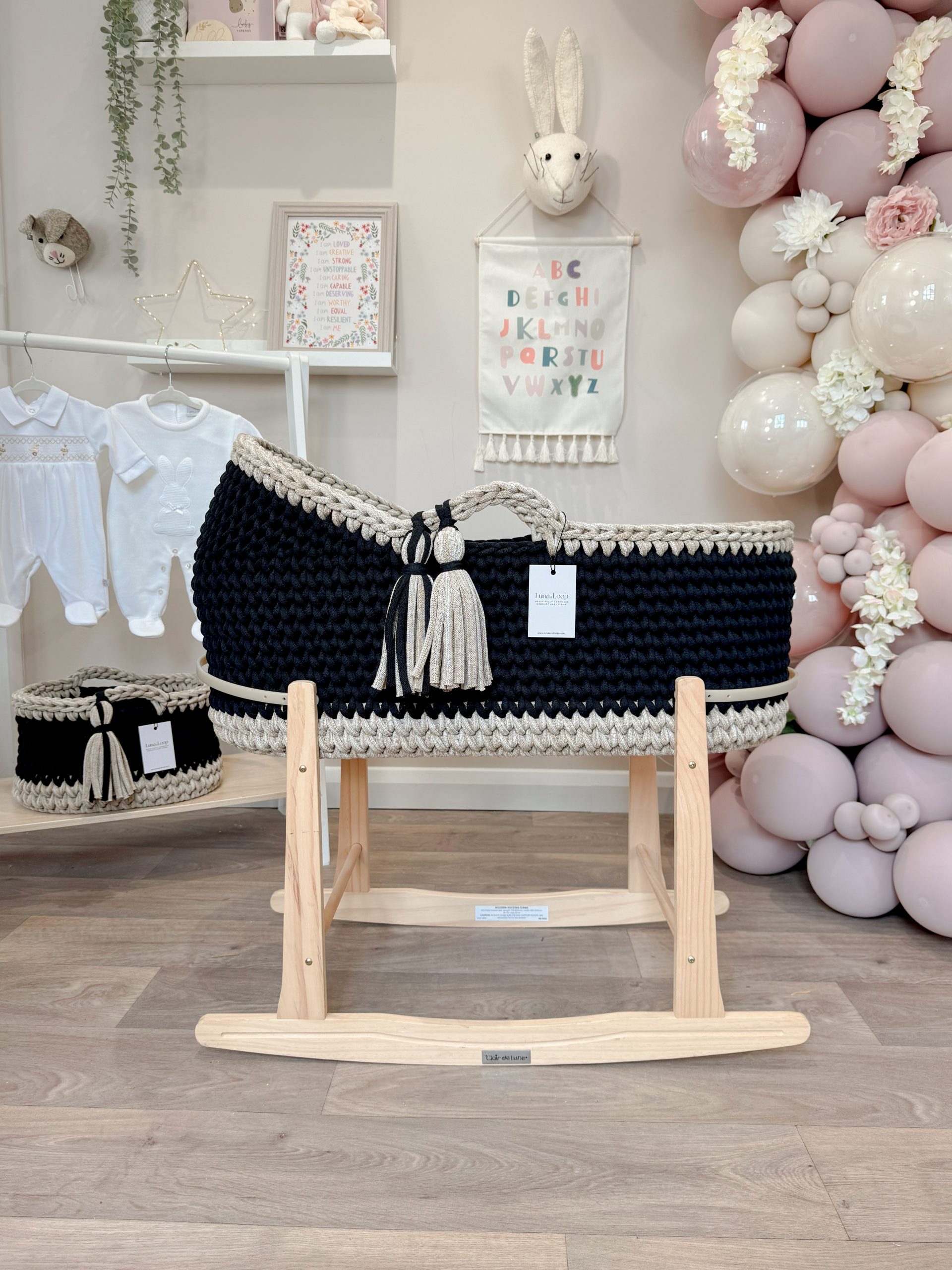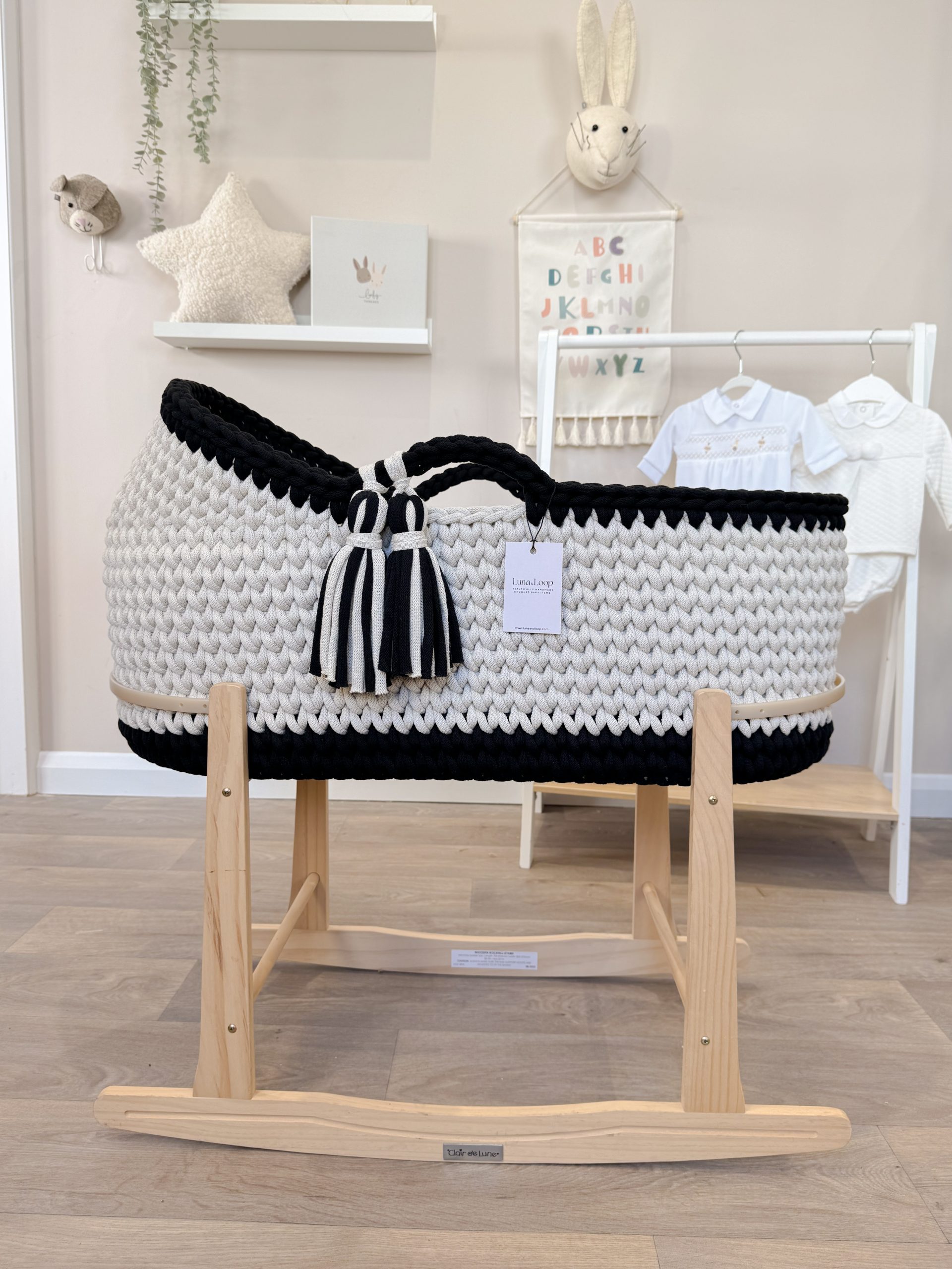 What’s in the box: A Hooded Crochet Moses basket, a hypoallergenic mattress, two fitted cotton sheets, a waterproof mattress protector, and your choice of rocking stand.