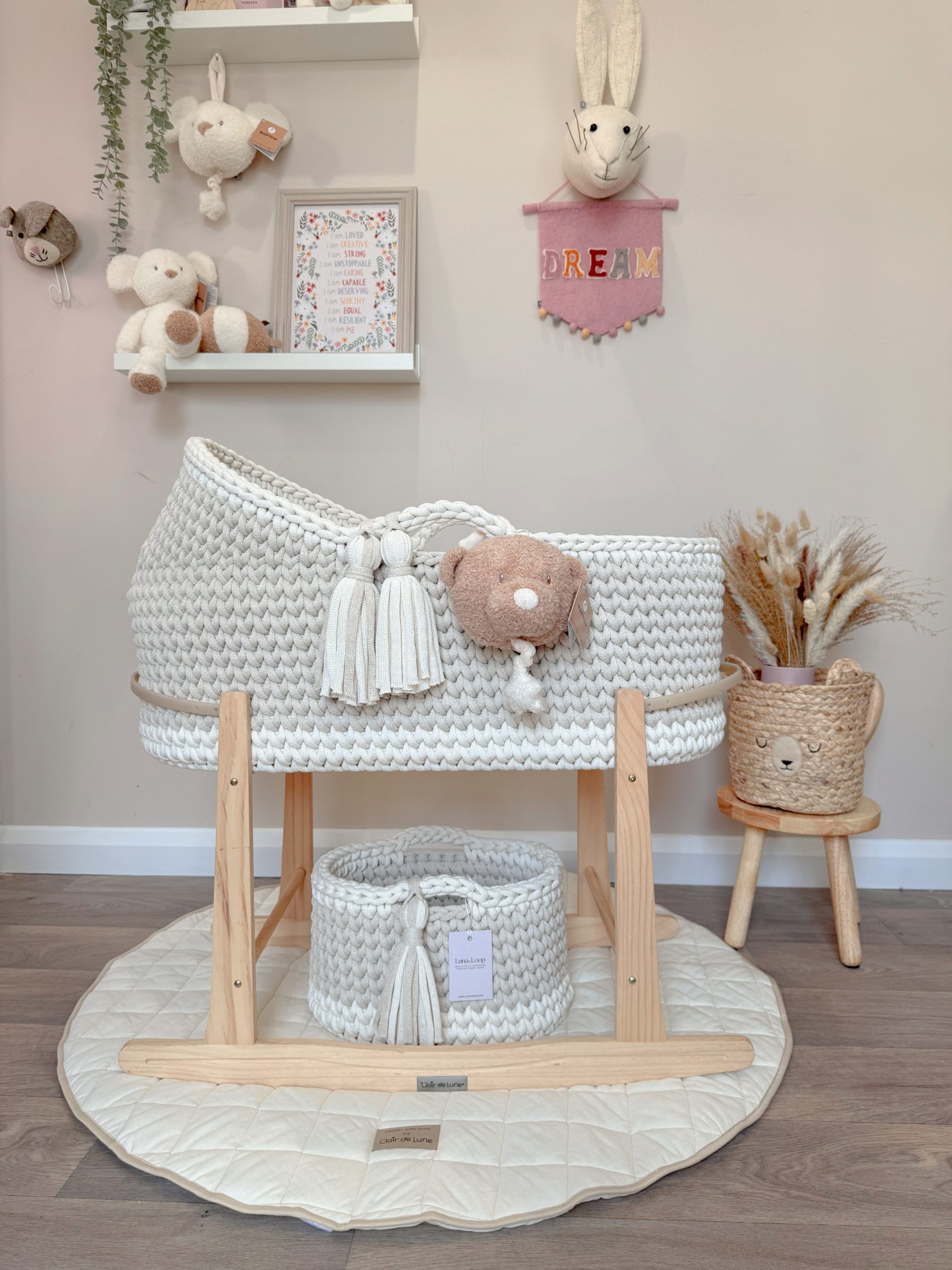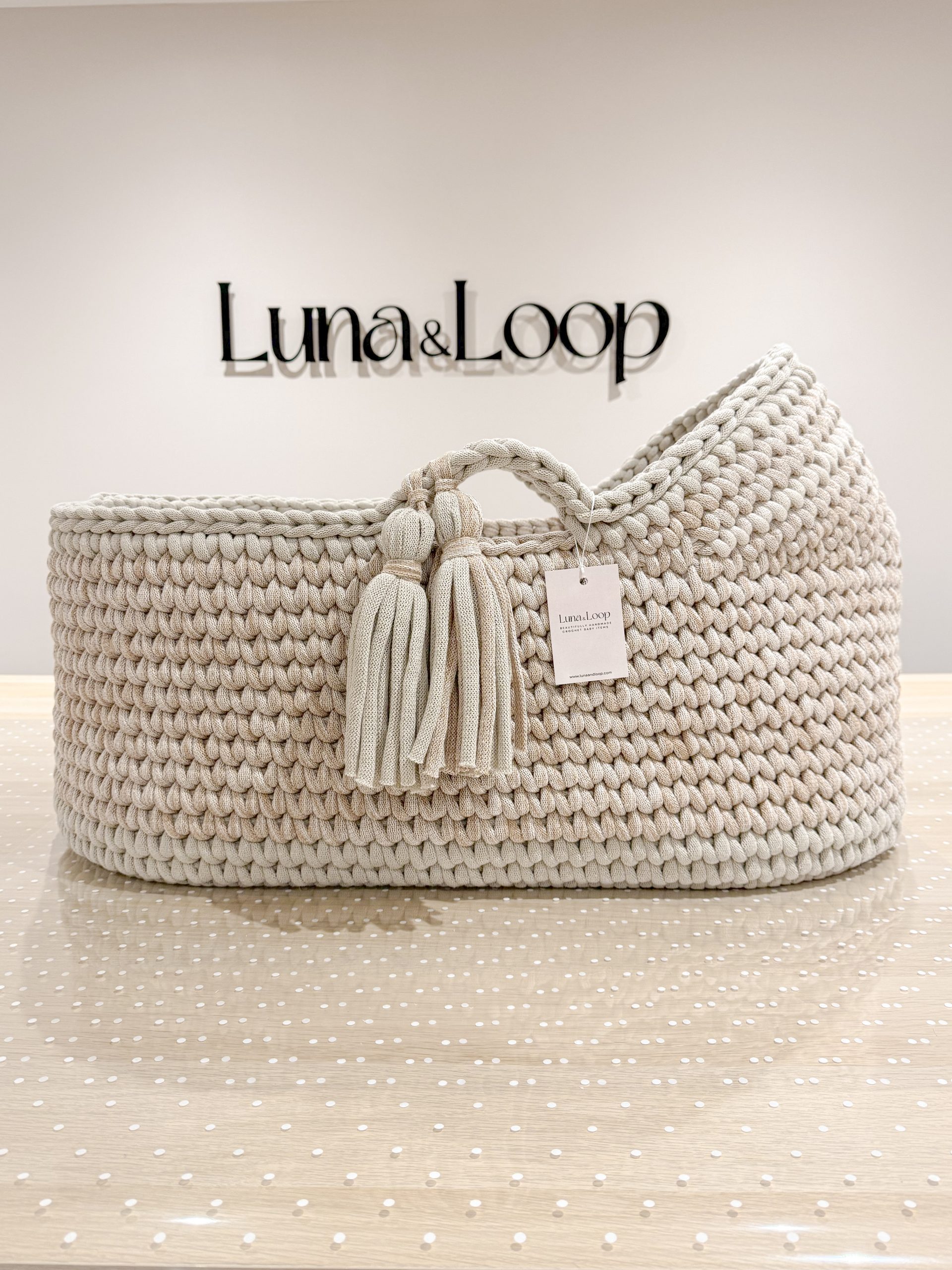 Welcome your little one into the world with our beautifully handcrafted Crochet Moses basket, made from soft, natural recycled cotton yarn. Thoughtfully designed to offer a cosy and safe space for your newborn, it’s a charming blend of traditional craftsmanship and modern sustainability. Certified by OEKO-TEX® Standard 100, you can rest assured no harmful substances have been used in the production or dyeing of the cotton – only the gentlest materials for your baby’s skin.