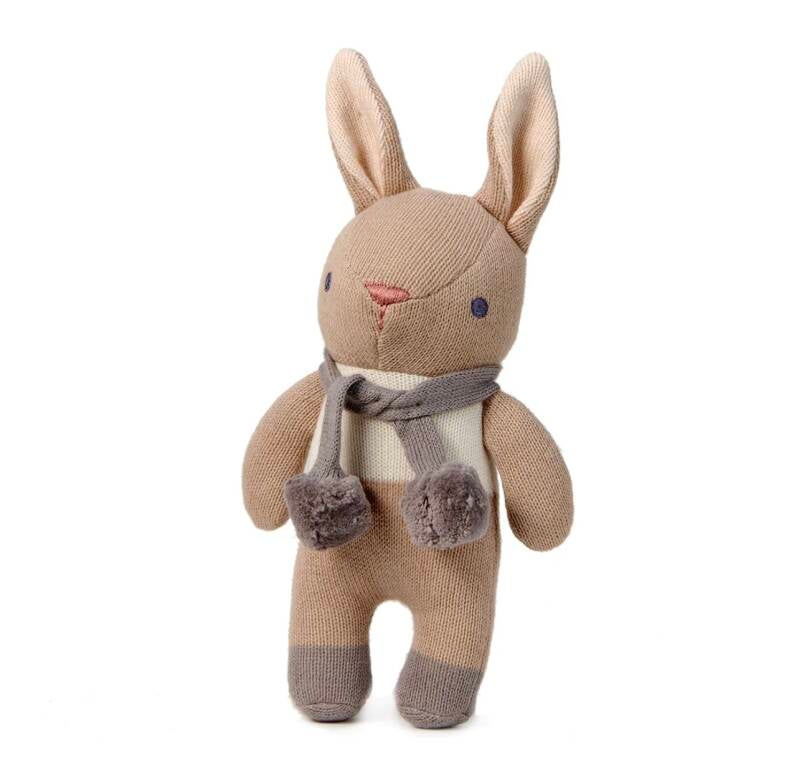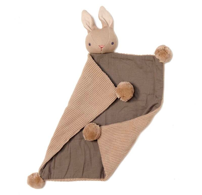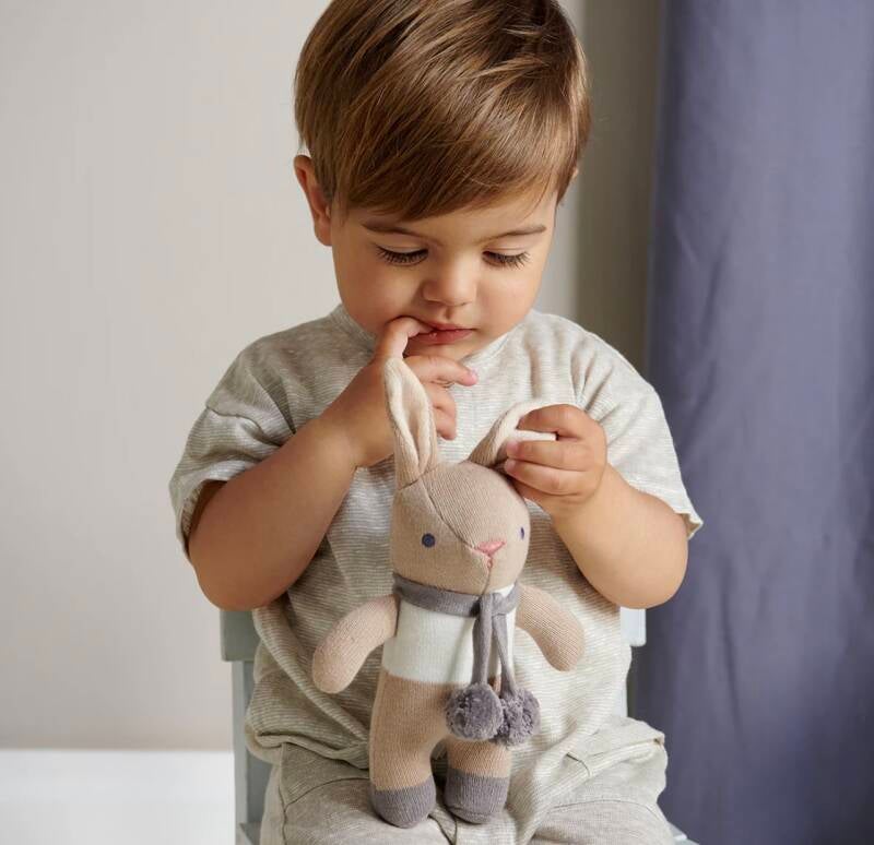 Presented in a charming illustrated gift box, this thoughtful set includes a knitted bunny comforter with a linen panel and delicate pom poms, alongside a soft bunny rattle that gently entertains with its soothing sound. Designed to be both comforting and engaging, it’s a lovely introduction to sensory play and bonding moments.