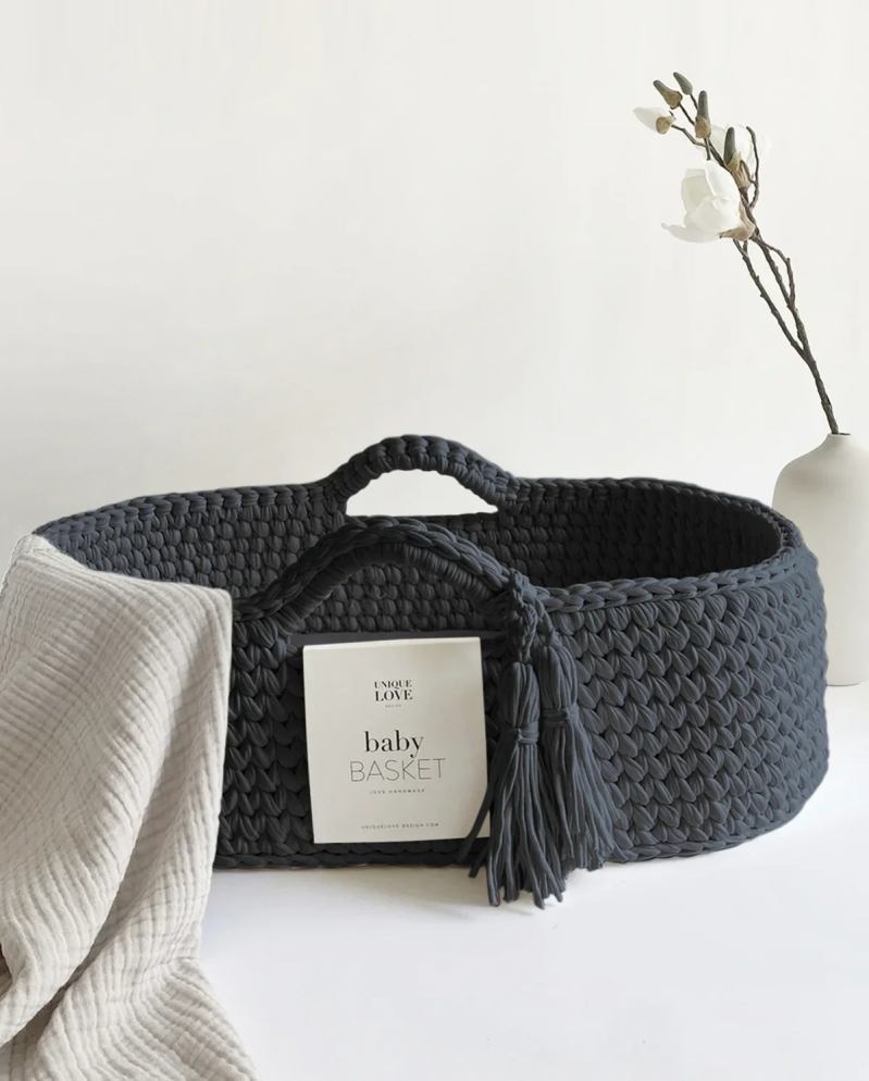 An incredibly beautiful and simple Crochet Moses Basket designed for a safe and peaceful sleep for your newborn. The soft cotton walls, the padded mattress and the cozy pillow make this first bed a very beautiful and cosy place.