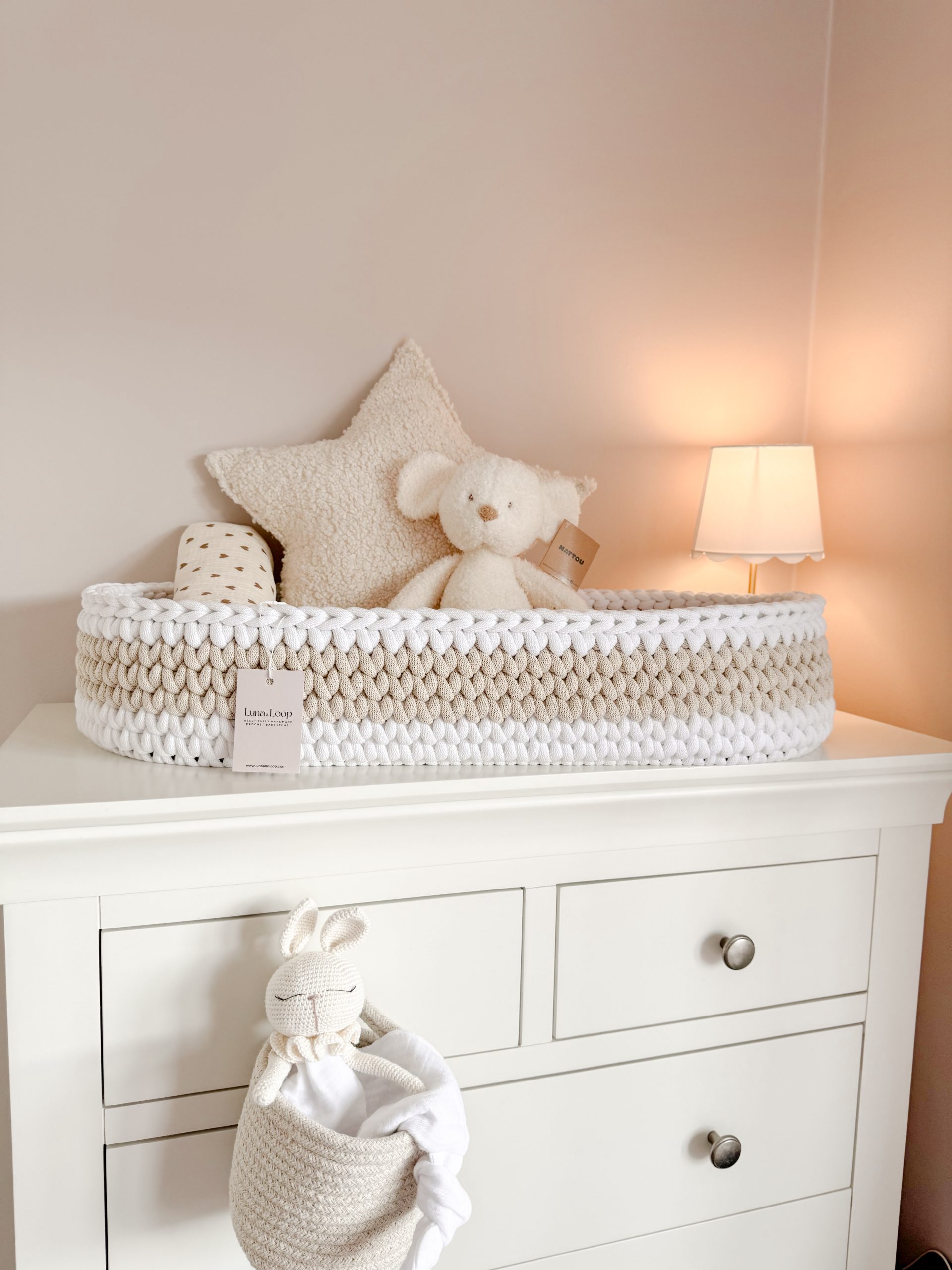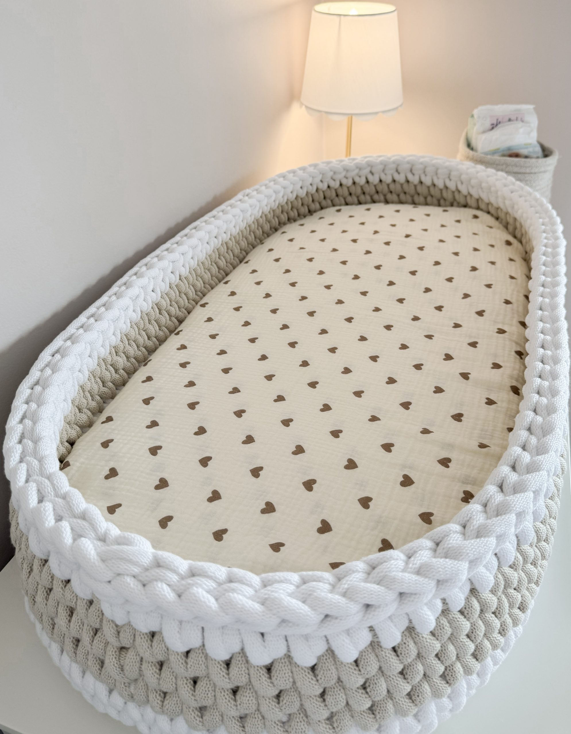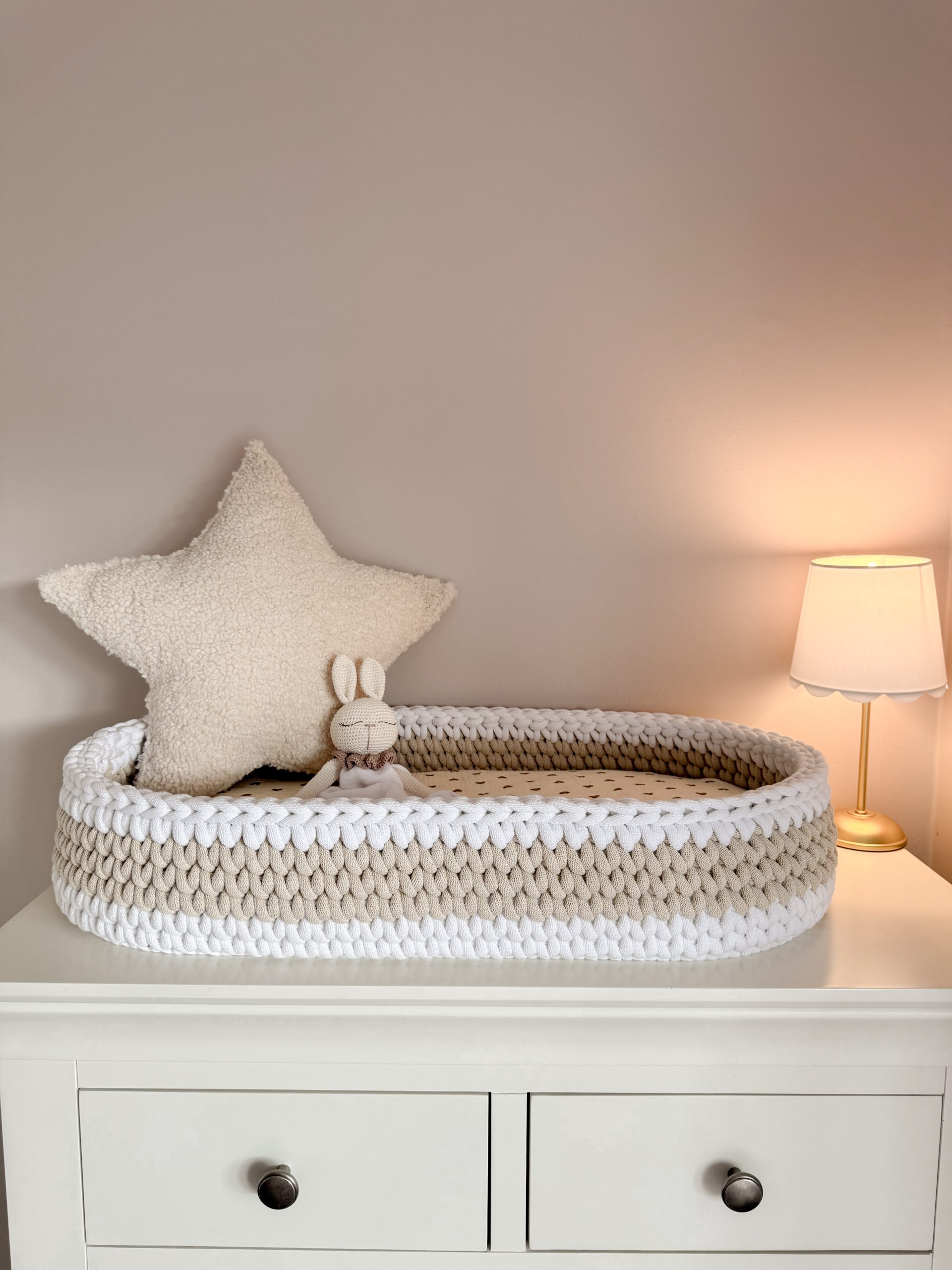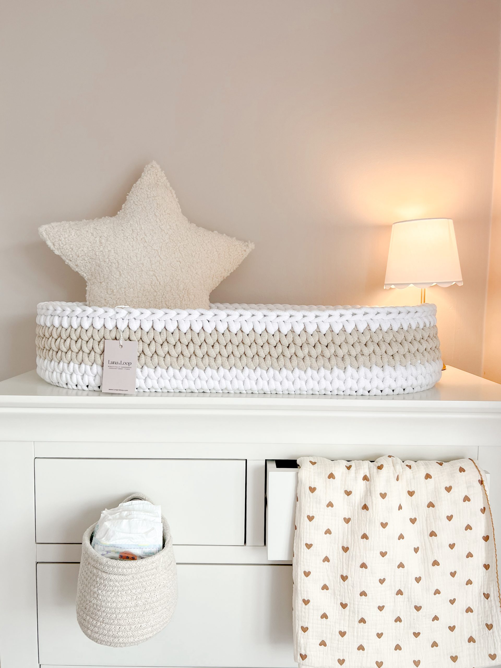 Welcome your little one into the world with our beautifully handcrafted XL Crochet Changing Basket, made from soft, natural recycled cotton yarn. Thoughtfully designed to offer a cosy and safe space for your newborn, it’s a charming blend of traditional craftsmanship and modern sustainability. Certified by OEKO-TEX® Standard 100, you can rest assured no harmful substances have been used in the production or dyeing of the cotton – only the gentlest materials for your baby’s skin.